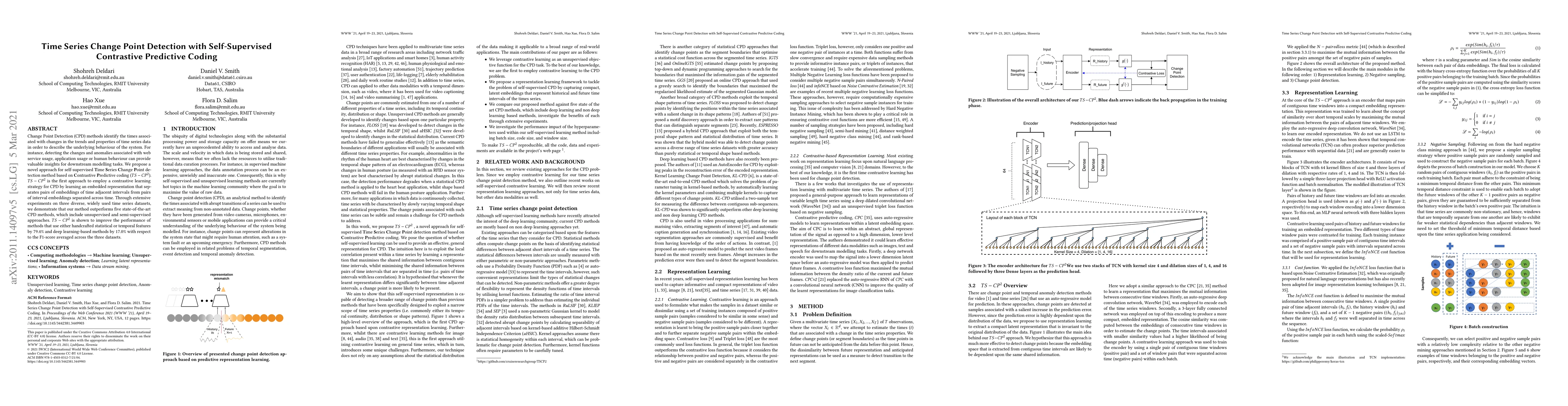 This paper proposes a novel self-supervised method, TS-CP^2, for Time Series Change Point Detection using Contrastive Predictive Coding. The method outperforms existing state-of-the-art approaches by 79.4% for feature-based methods and 17.0% for deep learning-based methods in F1-score across three datasets.