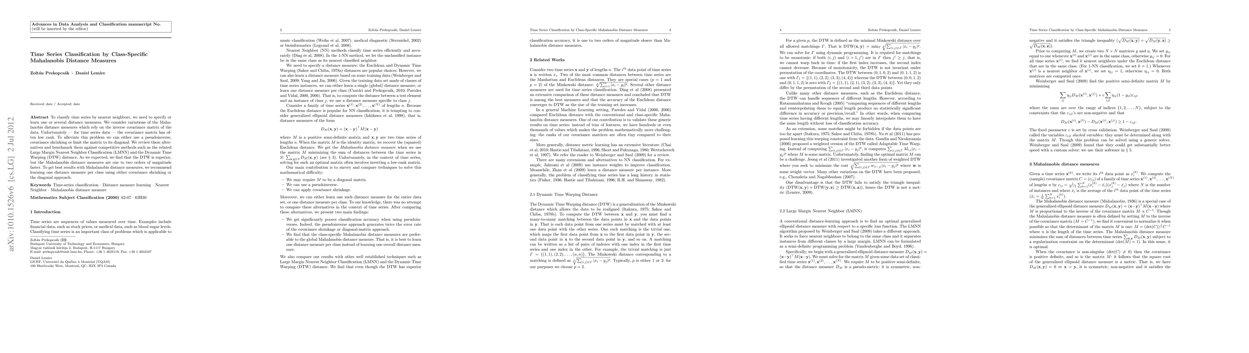 This paper explores class-specific Mahalanobis distance measures for time series classification, comparing them to Dynamic Time Warping and Large Margin Nearest Neighbor Classification. It finds that while Dynamic Time Warping is more accurate, Mahalanobis distances, especially those using covariance shrinking or diagonal matrices, are significantly faster.