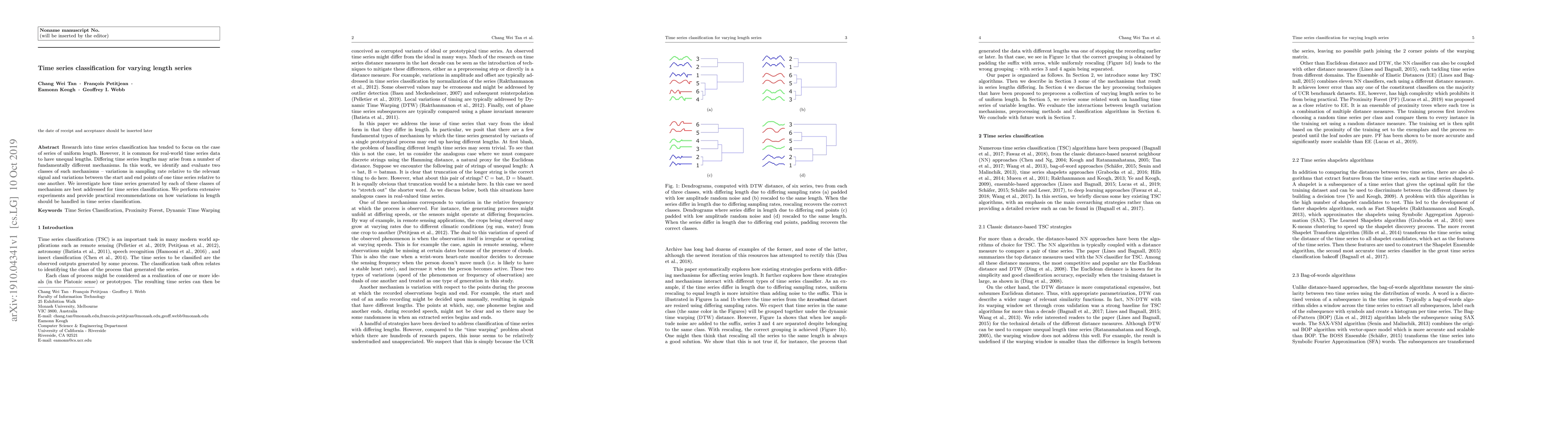 This research explores time series classification for data with varying lengths, common in real-world scenarios. It identifies two main causes of unequal lengths - sampling rate variations and differences in time series start/end points, providing experimental-based recommendations for handling these variations in classification tasks.