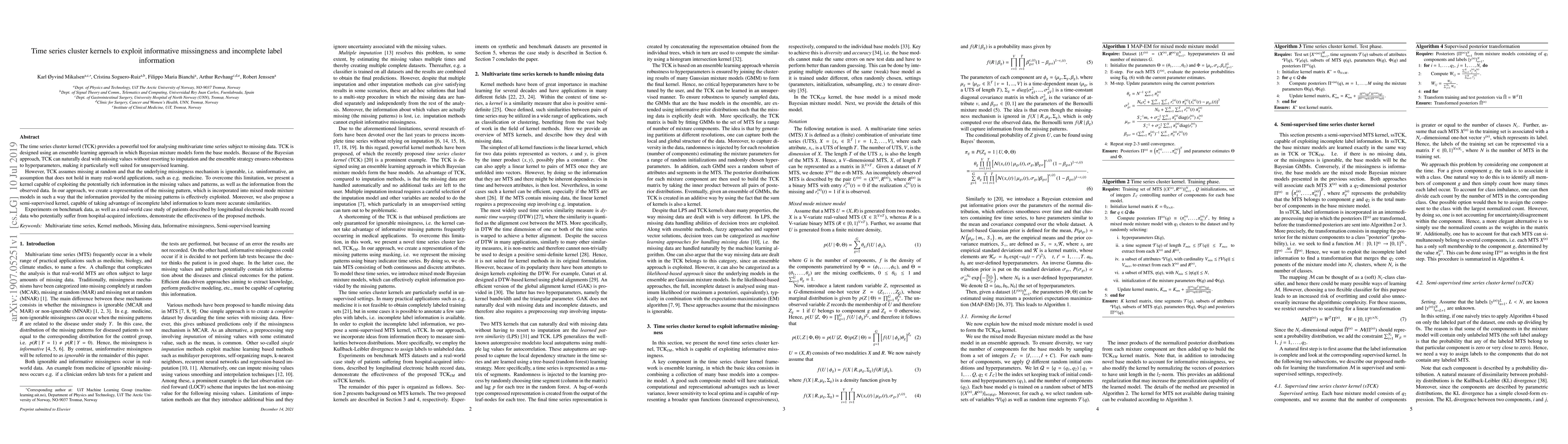 The paper introduces a time series cluster kernel (TCK) that leverages ensemble learning and Bayesian mixture models to handle multivariate time series with missing data. To overcome the limitation of assuming ignorable missingness, the authors propose a new kernel that incorporates missing pattern information and a semi-supervised kernel to utilize incomplete label data, demonstrating effectiveness through experiments on benchmark and real-world health data.