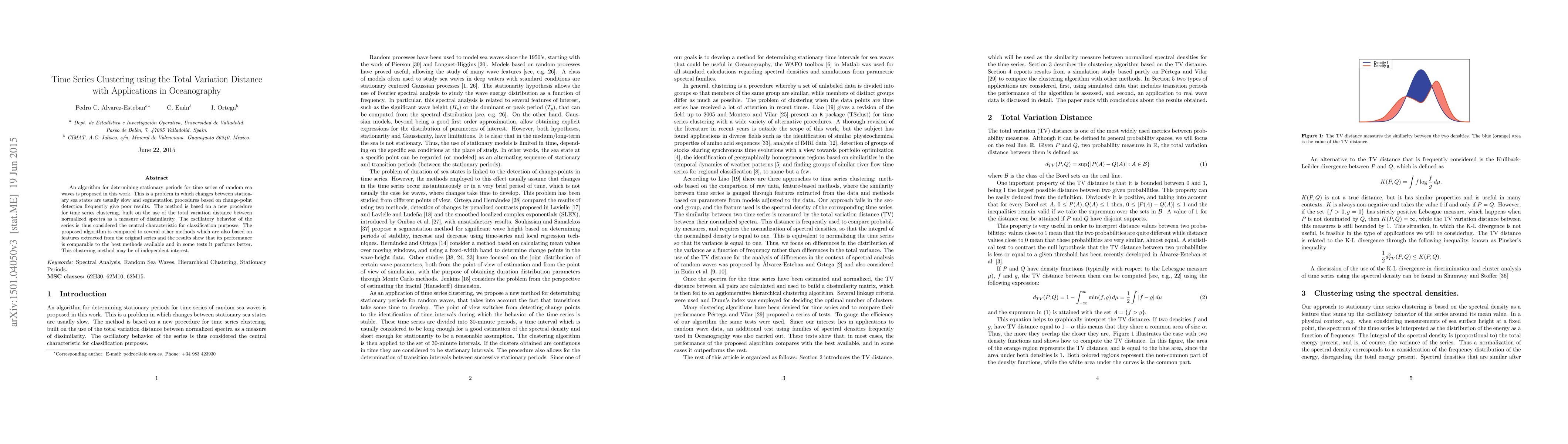 An algorithm for determining stationary periods for time series of random sea waves is proposed in this work. This is a problem in which changes between stationary sea states are usually slow and segmentation procedures based on change-point detection frequently give poor results. The method is based on a new procedure for time series clustering, built on the use of the total variation distance between normalized spectra as a measure of dissimilarity. The oscillatory behavior of the series is thus considered the central characteristic for classification purposes. The proposed algorithm is compared to several other methods which are also based on features extracted from the original series and the results show that its performance is comparable to the best methods available and in some tests it performs better. This clustering method may be of independent interest.