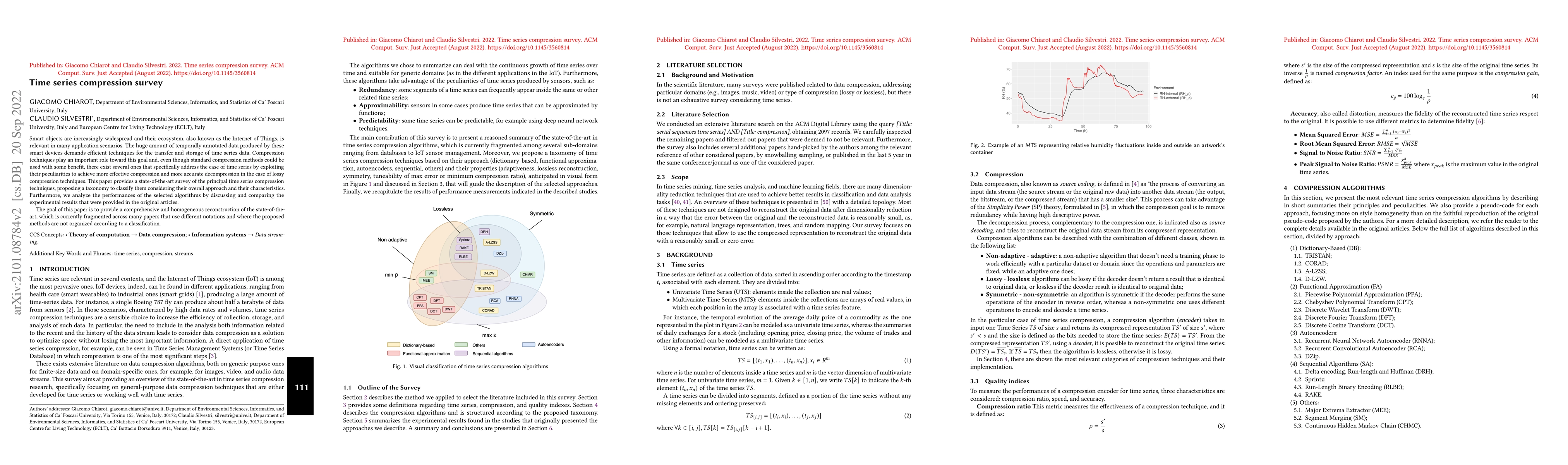This paper provides a comprehensive survey of time series compression techniques, proposing a taxonomy to classify them based on their overall approach and characteristics. It analyzes the performance of selected algorithms by comparing experimental results from original articles, addressing the fragmented state of current literature.