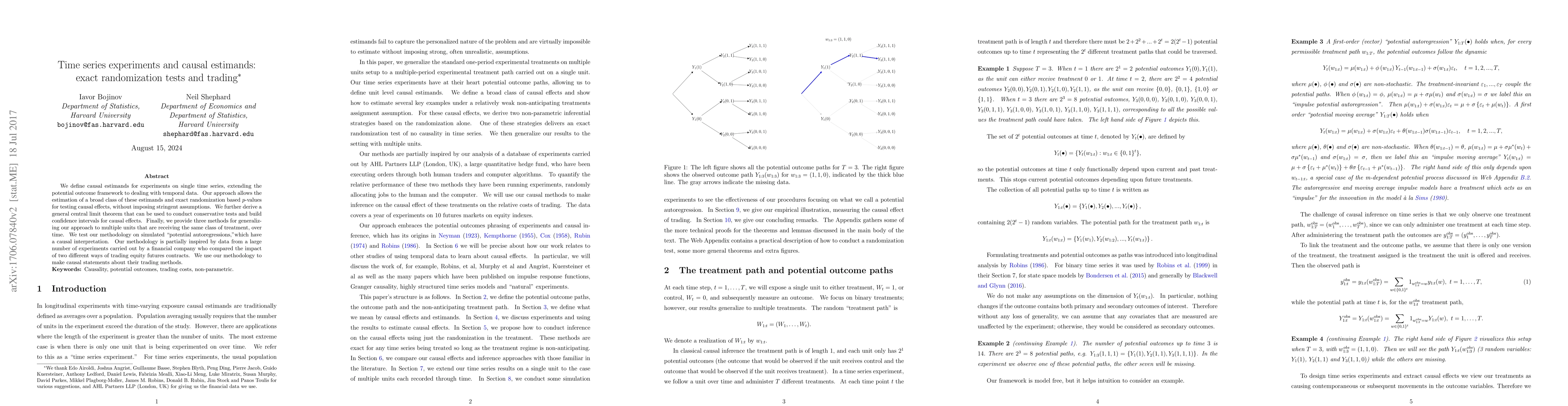 We define causal estimands for experiments on single time series, extending the potential outcome framework to dealing with temporal data. Our approach allows the estimation of some of these estimands and exact randomization based p-values for testing causal effects, without imposing stringent assumptions. We test our methodology on simulated "potential autoregressions,"which have a causal interpretation. Our methodology is partially inspired by data from a large number of experiments carried out by a financial company who compared the impact of two different ways of trading equity futures contracts. We use our methodology to make causal statements about their trading methods.