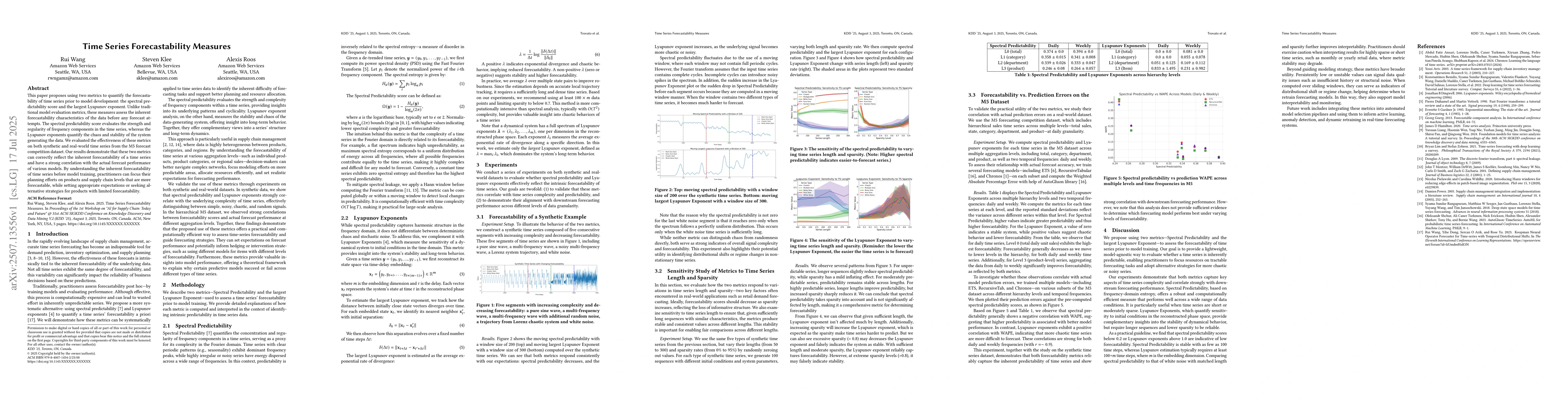 This paper proposes using two metrics to quantify the forecastability of time series prior to model development: the spectral predictability score and the largest Lyapunov exponent. Unlike traditional model evaluation metrics, these measures assess the inherent forecastability characteristics of the data before any forecast attempts. The spectral predictability score evaluates the strength and regularity of frequency components in the time series, whereas the Lyapunov exponents quantify the chaos and stability of the system generating the data. We evaluated the effectiveness of these metrics on both synthetic and real-world time series from the M5 forecast competition dataset. Our results demonstrate that these two metrics can correctly reflect the inherent forecastability of a time series and have a strong correlation with the actual forecast performance of various models. By understanding the inherent forecastability of time series before model training, practitioners can focus their planning efforts on products and supply chain levels that are more forecastable, while setting appropriate expectations or seeking alternative strategies for products with limited forecastability.