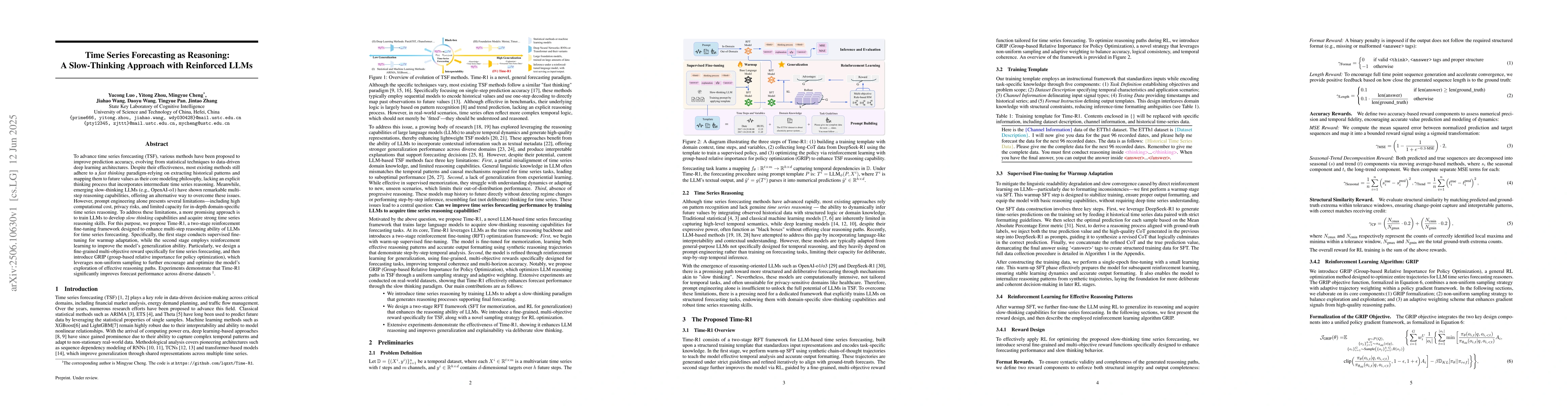Time-R1, a two-stage reinforcement fine-tuning framework, enhances LLMs' multi-step reasoning ability for time series forecasting, combining supervised fine-tuning with reinforcement learning and introducing GRIP for policy optimization.
