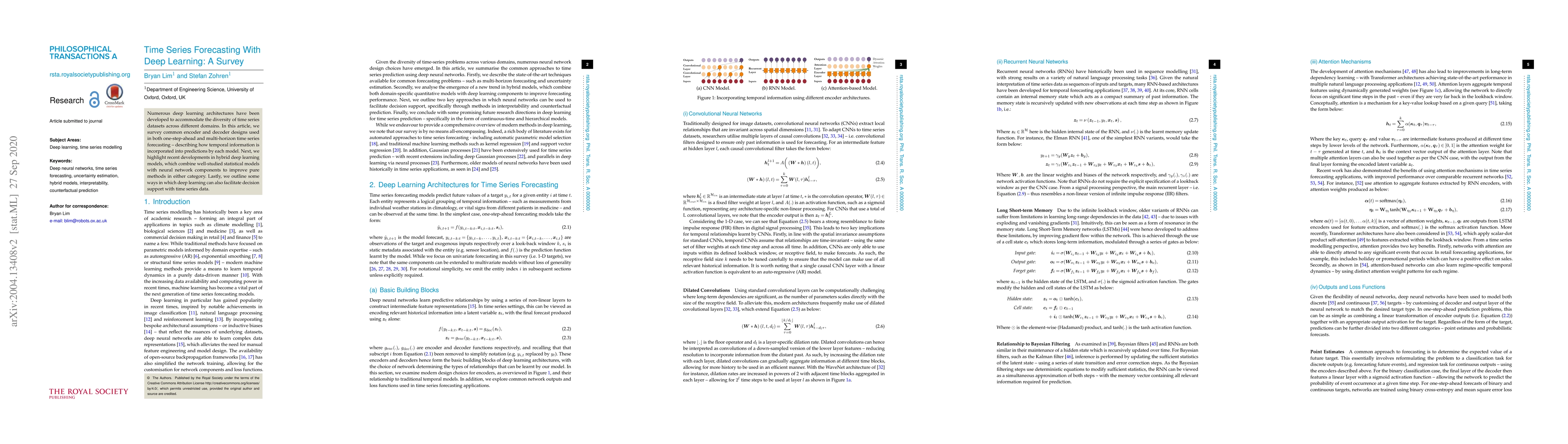 Numerous deep learning architectures have been developed to accommodate the diversity of time series datasets across different domains. In this article, we survey common encoder and decoder designs used in both one-step-ahead and multi-horizon time series forecasting -- describing how temporal information is incorporated into predictions by each model. Next, we highlight recent developments in hybrid deep learning models, which combine well-studied statistical models with neural network components to improve pure methods in either category. Lastly, we outline some ways in which deep learning can also facilitate decision support with time series data.
