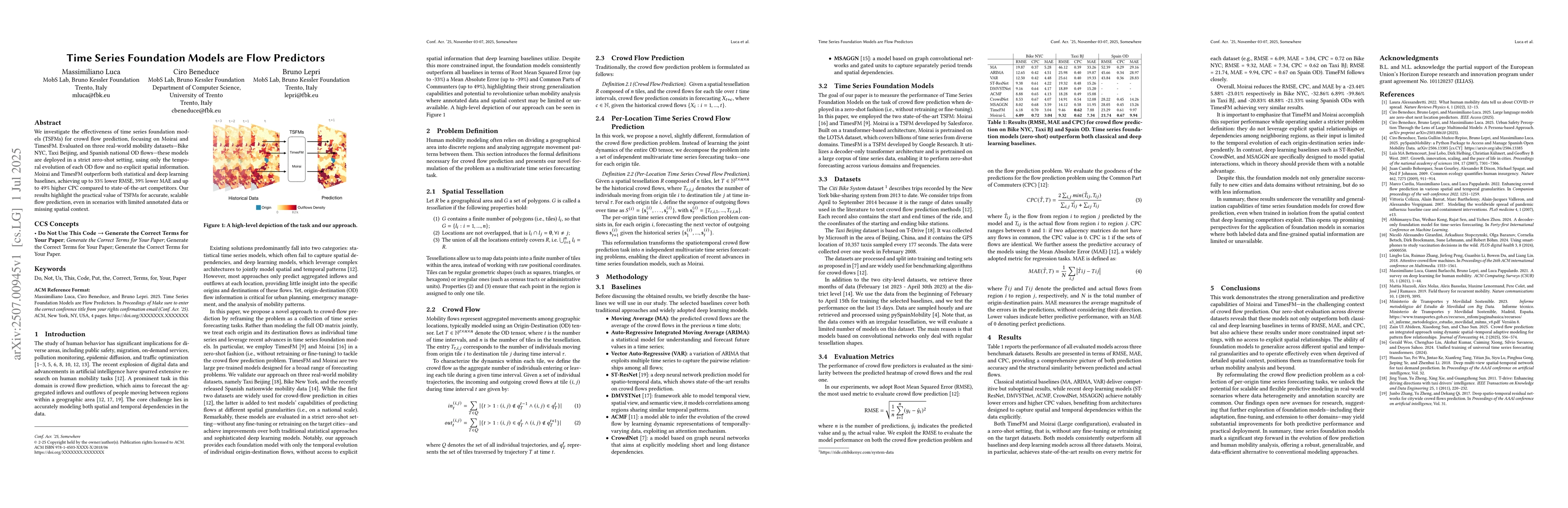 We investigate the effectiveness of time series foundation models (TSFMs) for crowd flow prediction, focusing on Moirai and TimesFM. Evaluated on three real-world mobility datasets-Bike NYC, Taxi Beijing, and Spanish national OD flows-these models are deployed in a strict zero-shot setting, using only the temporal evolution of each OD flow and no explicit spatial information. Moirai and TimesFM outperform both statistical and deep learning baselines, achieving up to 33% lower RMSE, 39% lower MAE and up to 49% higher CPC compared to state-of-the-art competitors. Our results highlight the practical value of TSFMs for accurate, scalable flow prediction, even in scenarios with limited annotated data or missing spatial context.