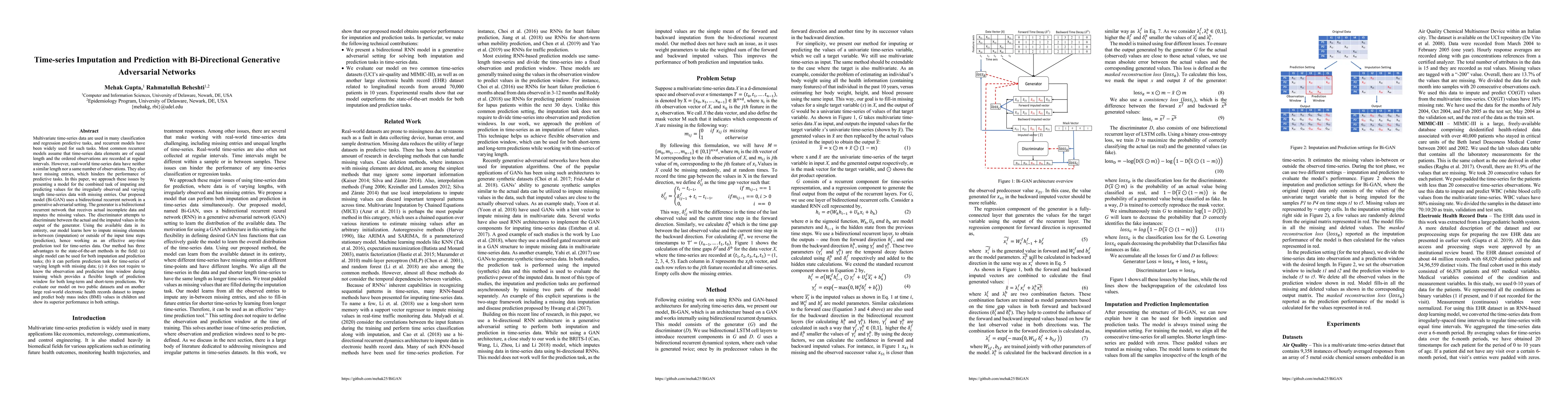 This paper proposes a Bi-GAN model for time-series imputation and prediction, using a bidirectional recurrent network in a generative adversarial setting. The model effectively handles irregularly observed and varying length time-series data with missing entries, offering superior performance compared to state-of-the-art methods.