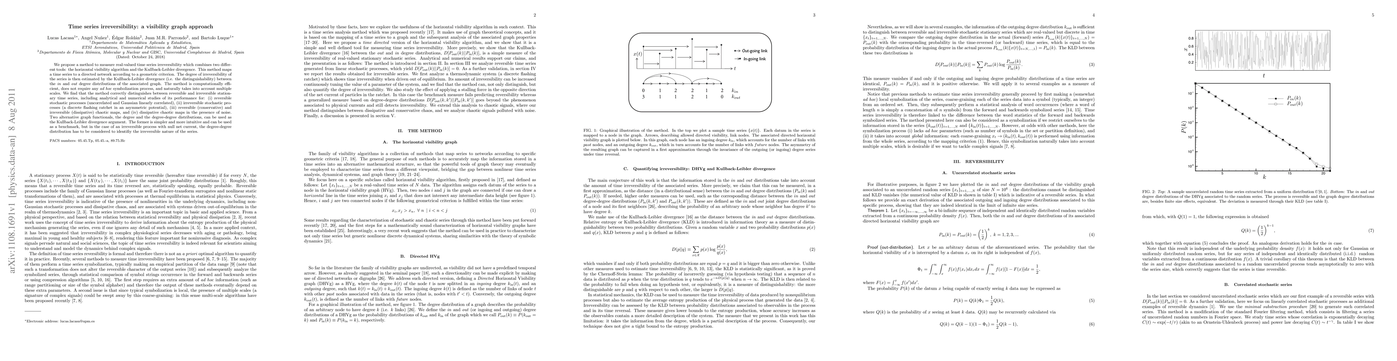 We propose a method to measure real-valued time series irreversibility which combines two differ- ent tools: the horizontal visibility algorithm and the Kullback-Leibler divergence. This method maps a time series to a directed network according to a geometric criterion. The degree of irreversibility of the series is then estimated by the Kullback-Leibler divergence (i.e. the distinguishability) between the in and out degree distributions of the associated graph. The method is computationally effi- cient, does not require any ad hoc symbolization process, and naturally takes into account multiple scales. We find that the method correctly distinguishes between reversible and irreversible station- ary time series, including analytical and numerical studies of its performance for: (i) reversible stochastic processes (uncorrelated and Gaussian linearly correlated), (ii) irreversible stochastic pro- cesses (a discrete flashing ratchet in an asymmetric potential), (iii) reversible (conservative) and irreversible (dissipative) chaotic maps, and (iv) dissipative chaotic maps in the presence of noise. Two alternative graph functionals, the degree and the degree-degree distributions, can be used as the Kullback-Leibler divergence argument. The former is simpler and more intuitive and can be used as a benchmark, but in the case of an irreversible process with null net current, the degree-degree distribution has to be considered to identifiy the irreversible nature of the series.