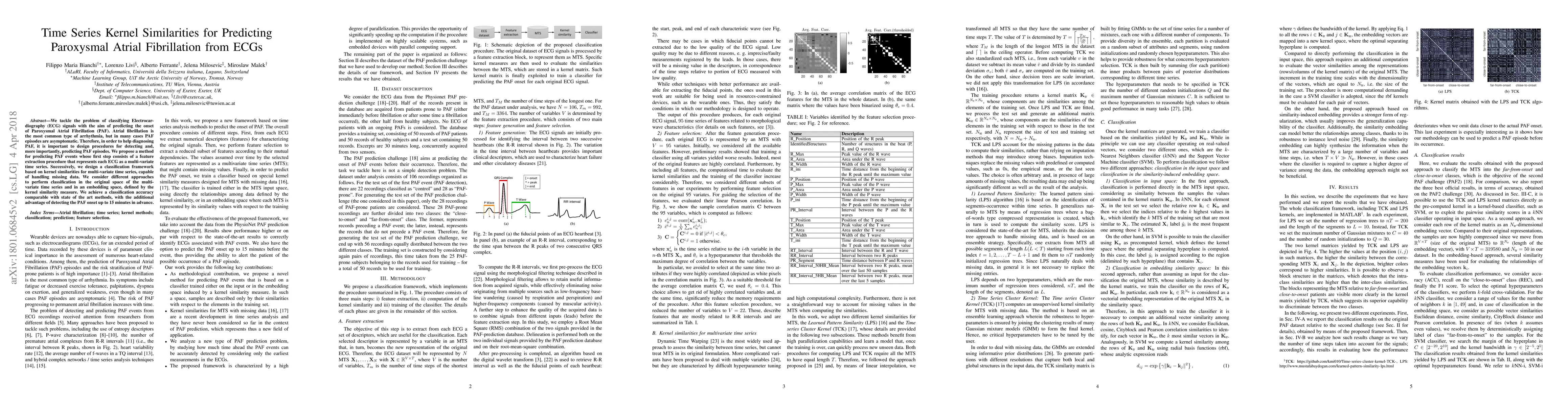 We tackle the problem of classifying Electrocardiography (ECG) signals with the aim of predicting the onset of Paroxysmal Atrial Fibrillation (PAF). Atrial fibrillation is the most common type of arrhythmia, but in many cases PAF episodes are asymptomatic. Therefore, in order to help diagnosing PAF, it is important to design procedures for detecting and, more importantly, predicting PAF episodes. We propose a method for predicting PAF events whose first step consists of a feature extraction procedure that represents each ECG as a multi-variate time series. Successively, we design a classification framework based on kernel similarities for multi-variate time series, capable of handling missing data. We consider different approaches to perform classification in the original space of the multi-variate time series and in an embedding space, defined by the kernel similarity measure. We achieve a classification accuracy comparable with state of the art methods, with the additional advantage of detecting the PAF onset up to 15 minutes in advance.