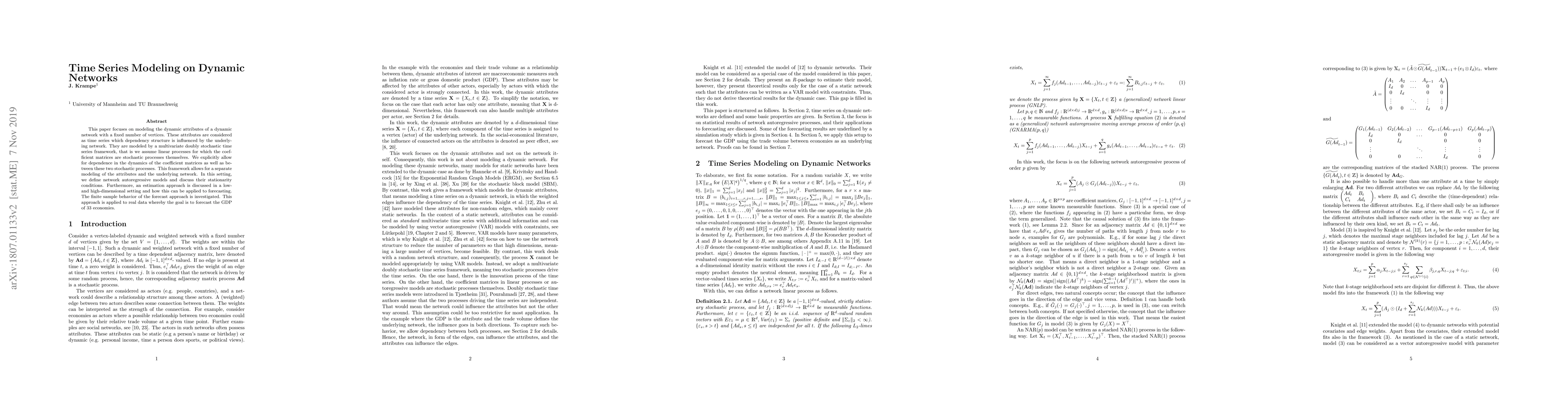 This paper proposes a new method to model time series data on dynamic networks, allowing for separate modeling of attributes and underlying networks, with applications in forecasting economic indicators like GDP.