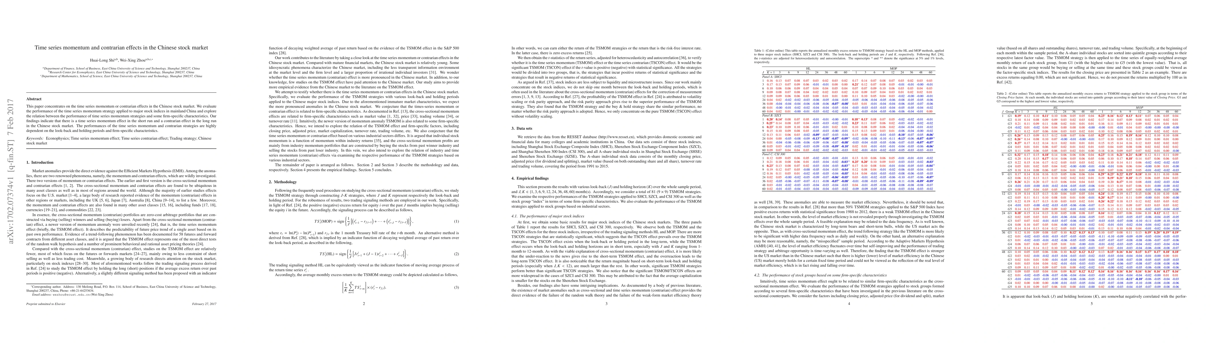 This paper examines time series momentum and contrarian effects in the Chinese stock market, finding short-term momentum and long-term contrarian effects. The performance of these strategies is influenced by look-back and holding periods, as well as firm-specific characteristics.