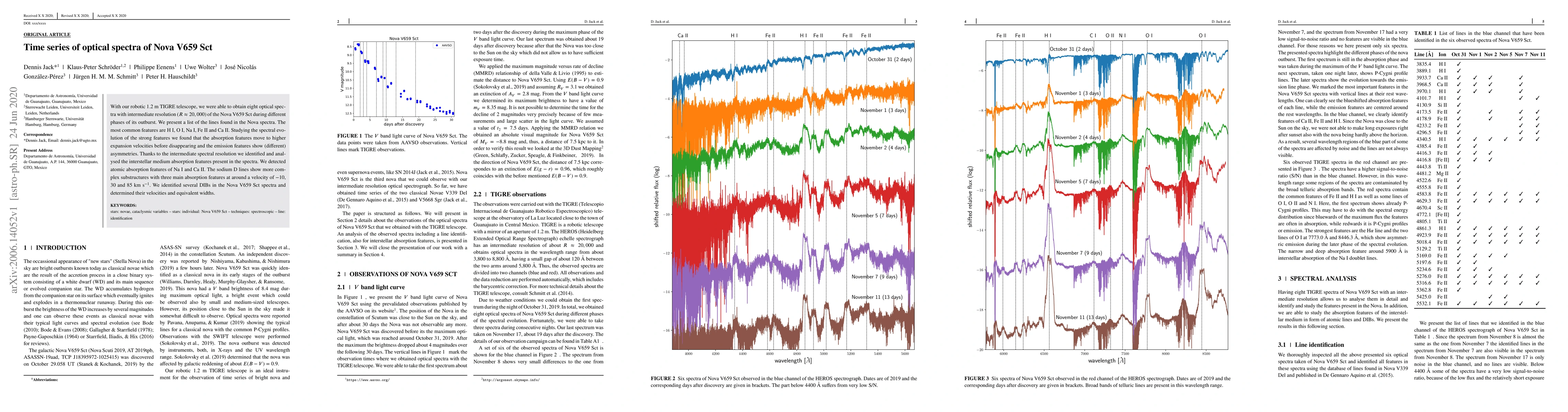 With our robotic 1.2 m TIGRE telescope, we were able to obtain eight optical spectra with intermediate resolution (R = 20,000) of the Nova V659 Sct during different phases of its outburst. We present a list of the lines found in the Nova spectra. The most common features are H I, O I, Na I, Fe II and Ca II. Studying the spectral evolution of the strong features we found that the absorption features move to higher expansion velocities before disappearing and the emission features show (different) asymmetries. Thanks to the intermediate spectral resolution we identified and analysed the interstellar medium absorption features present in the spectra. We detected atomic absorption features of Na I and Ca II. The sodium D lines show more complex substructures with three main absorption features at around a velocity of -10, 30 and 85 km/s. We identified several DIBs in the Nova V659 Sct spectra and determined their velocities and equivalent widths.