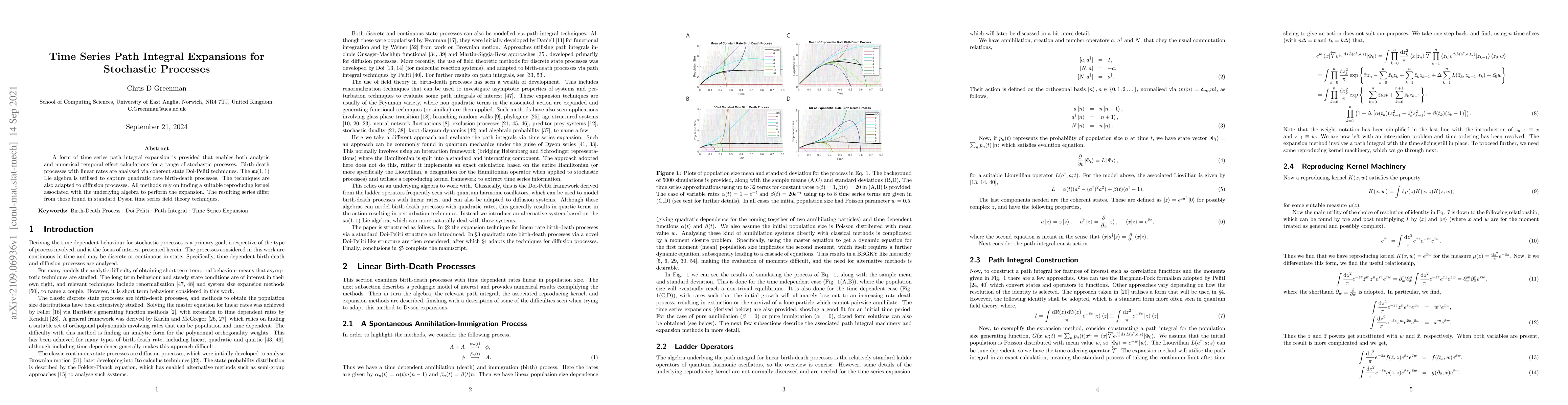A form of time series path integral expansion is provided that enables both analytic and numerical temporal effect calculations for a range of stochastic processes. Birth-death processes with linear rates are analysed via coherent state Doi-Peliti techniques. The $\mathfrak{su}(1,1)$ Lie algebra is utilised to capture quadratic rate birth-death processes. The techniques are also adapted to diffusion processes. All methods rely on finding a suitable reproducing kernel associated with the underlying algebra to perform the expansion. The resulting series differ from those found in standard Dyson time series field theory techniques.