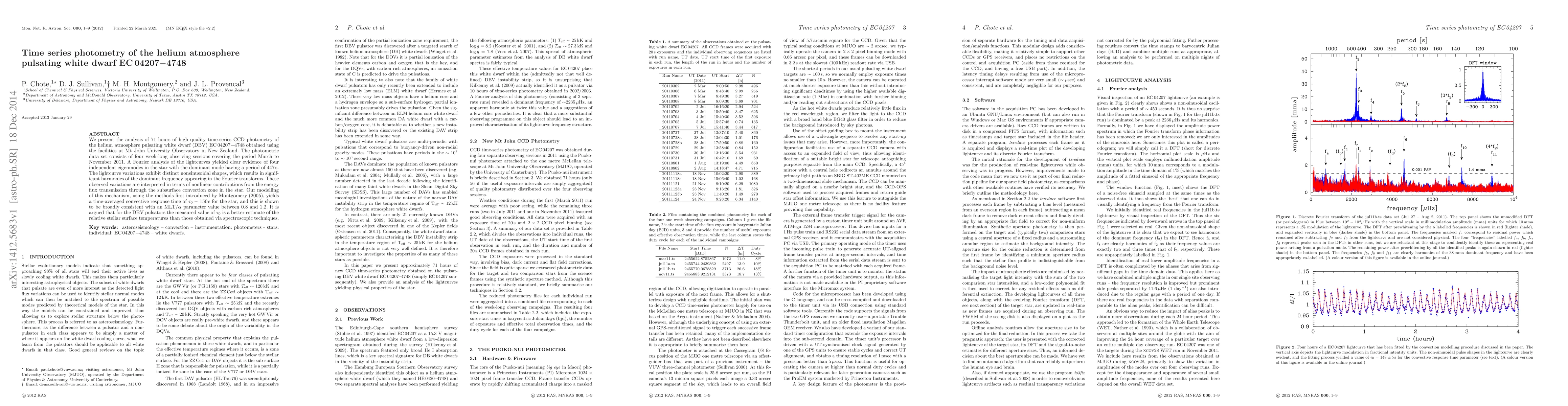 We present the analysis of 71 hours of high quality time-series CCD photometry of the helium atmosphere pulsating white dwarf (DBV) EC 04207-4748 obtained using the facilities at Mt John University Observatory in New Zealand. The photometric data set consists of four week-long observing sessions covering the period March to November 2011. A Fourier analysis of the lightcurves yielded clear evidence of four independent eigenmodes in the star with the dominant mode having a period of 447 s. The lightcurve variations exhibit distinct nonsinusoidal shapes, which results in significant harmonics of the dominant frequency appearing in the Fourier transforms. These observed variations are interpreted in terms of nonlinear contributions from the energy flux transmission through the subsurface convection zone in the star. Our modelling of this mechanism, using the methods first introduced by Montgomery (2005), yields a time-averaged convective response time of tau_0 ~ 150 s for the star, and this is shown to be broadly consistent with a MLT/alpha parameter value between 0.8 and 1.2. It is argued that for the DBV pulsators the measured value of tau_0 is a better estimate of the relative stellar surface temperatures than those obtained via spectroscopic techniques.