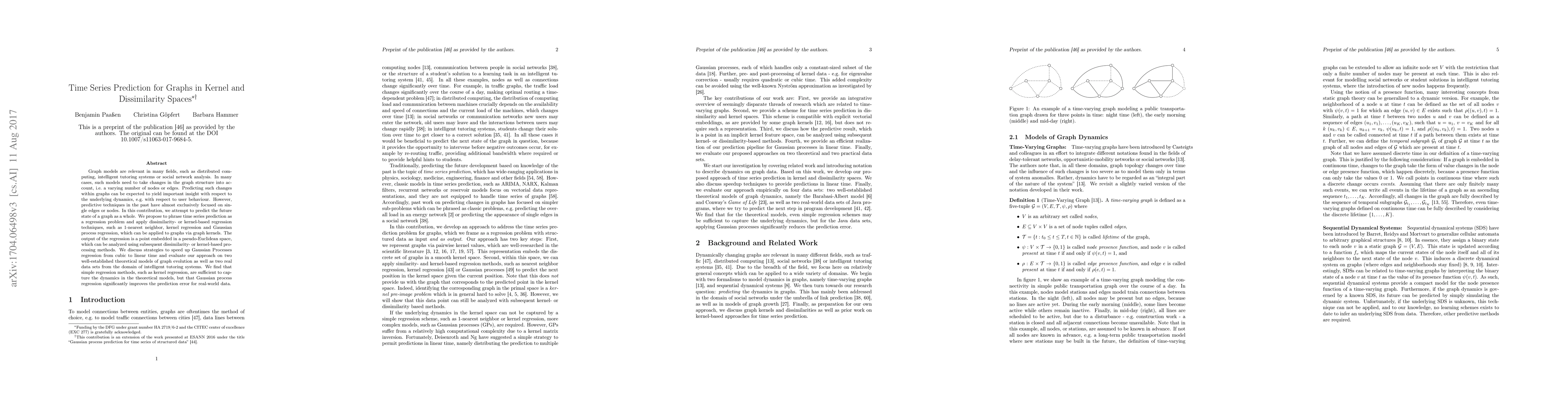 Graph models are relevant in many fields, such as distributed computing, intelligent tutoring systems or social network analysis. In many cases, such models need to take changes in the graph structure into account, i.e. a varying number of nodes or edges. Predicting such changes within graphs can be expected to yield important insight with respect to the underlying dynamics, e.g. with respect to user behaviour. However, predictive techniques in the past have almost exclusively focused on single edges or nodes. In this contribution, we attempt to predict the future state of a graph as a whole. We propose to phrase time series prediction as a regression problem and apply dissimilarity- or kernel-based regression techniques, such as 1-nearest neighbor, kernel regression and Gaussian process regression, which can be applied to graphs via graph kernels. The output of the regression is a point embedded in a pseudo-Euclidean space, which can be analyzed using subsequent dissimilarity- or kernel-based processing methods. We discuss strategies to speed up Gaussian Processes regression from cubic to linear time and evaluate our approach on two well-established theoretical models of graph evolution as well as two real data sets from the domain of intelligent tutoring systems. We find that simple regression methods, such as kernel regression, are sufficient to capture the dynamics in the theoretical models, but that Gaussian process regression significantly improves the prediction error for real-world data.