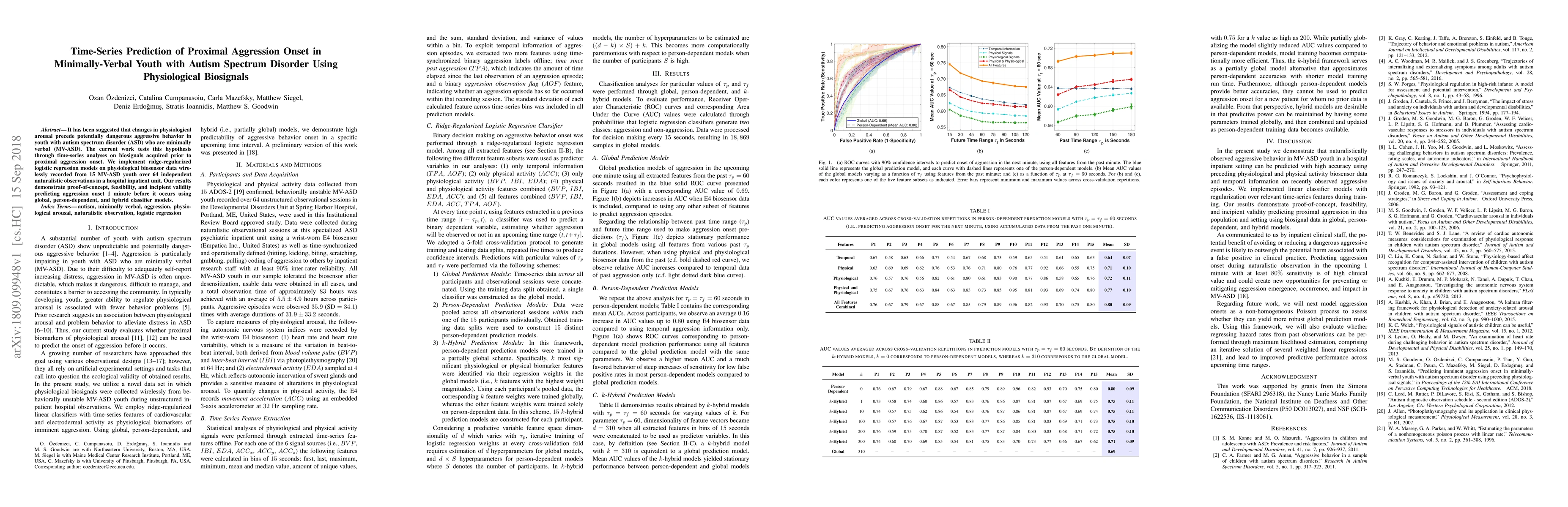 This study investigates the prediction of proximal aggression in minimally-verbal youth with autism spectrum disorder (MV-ASD) using physiological biosignals. The research successfully demonstrates the feasibility of predicting aggression onset 1 minute in advance using ridge-regularized logistic regression models on biosensor data, providing proof-of-concept for this approach.