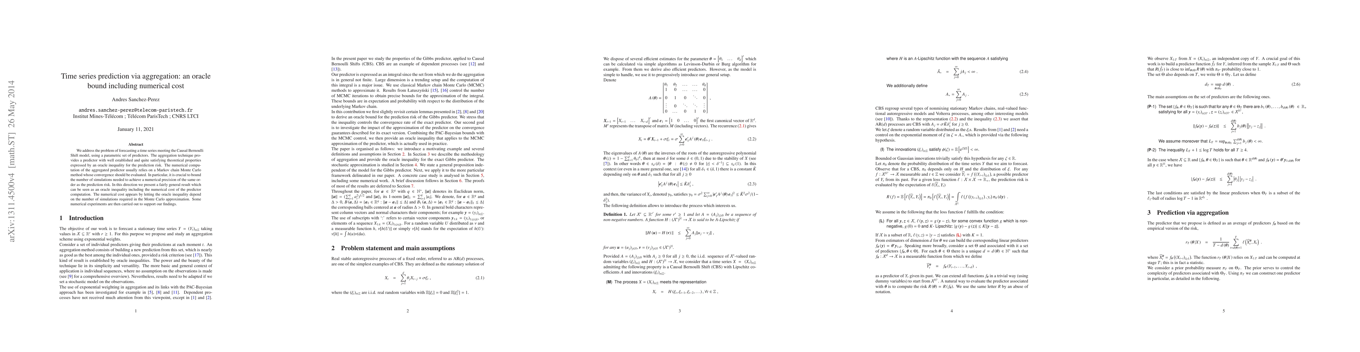 This paper presents a method for forecasting time series under the Causal Bernoulli Shift model using parametric predictors and aggregation technique. It establishes an oracle inequality for prediction risk and provides a general result to bound the number of simulations needed for numerical precision, considering computational cost.