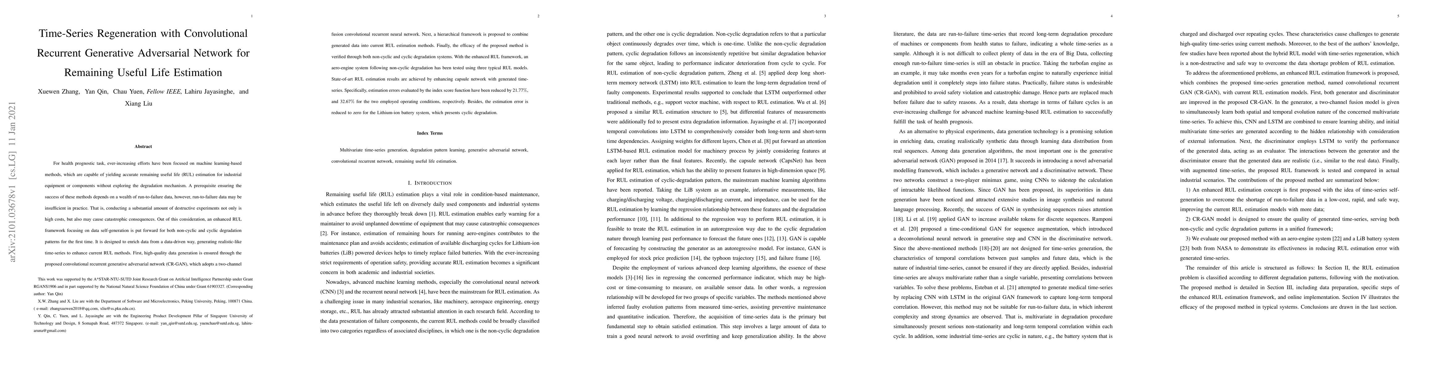 This paper proposes a convolutional recurrent generative adversarial network (CR-GAN) to generate realistic time-series data for enhancing remaining useful life (RUL) estimation methods, achieving state-of-the-art results in RUL estimation for both non-cyclic and cyclic degradation systems. The method reduces estimation errors by up to 32.67% for aero-engine systems and eliminates error for cyclic degradation in Lithium-ion batteries.