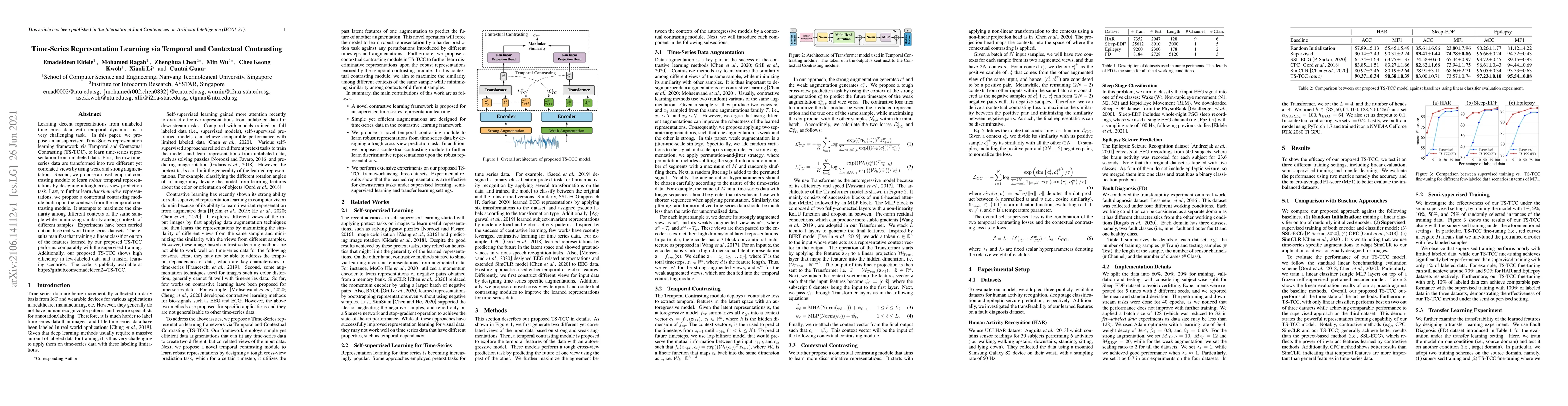 This paper presents an unsupervised framework, TS-TCC, for learning time-series representations from unlabeled data by contrasting temporal and contextual views through augmentations and a novel contrasting module. Experiments show that TS-TCC performs competitively with supervised methods and is effective in few-labeled and transfer learning scenarios.