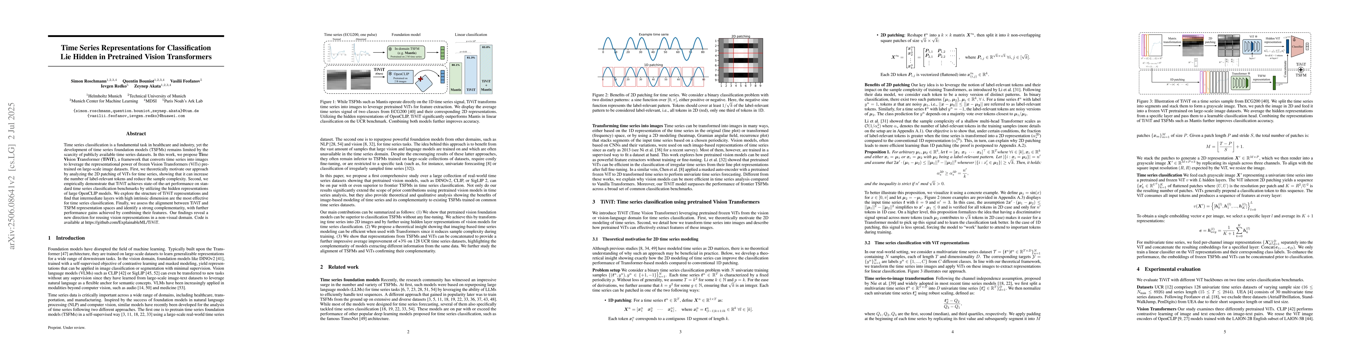 Researchers propose a new method to classify time series data using pre-trained vision transformers, achieving state-of-the-art performance on benchmarks. They find that intermediate layers of the transformer produce effective representations for time series classification.