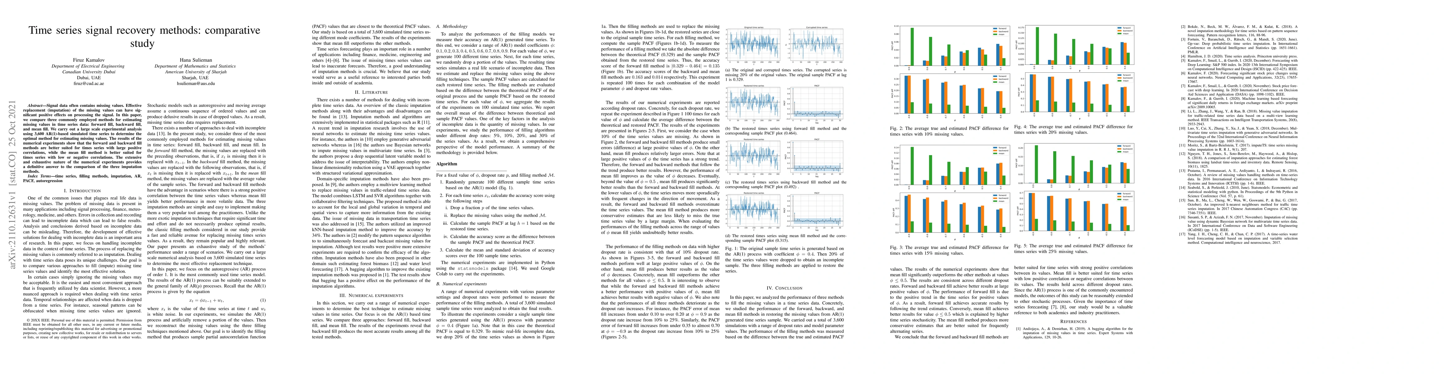 This paper compares three methods for estimating missing values in time series data: forward fill, backward fill, and mean fill. Experimental results from 3,600 simulated AR(1) time series show that forward and backward fill are optimal for series with high positive correlations, while mean fill is better for low or negative correlations.