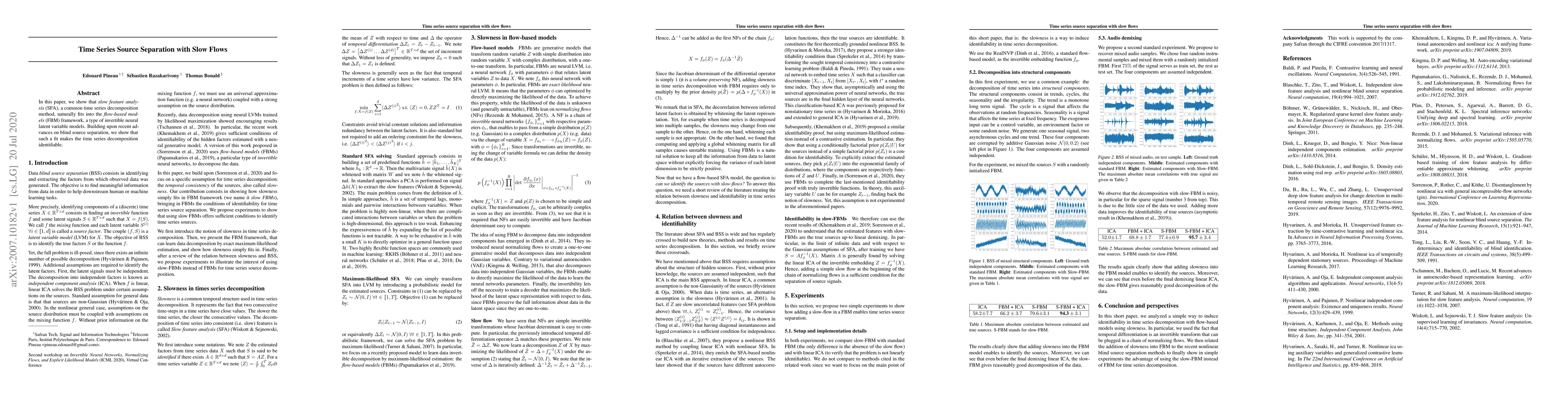 This paper demonstrates that slow feature analysis (SFA) can be integrated into flow-based models (FBM) for time series decomposition, leveraging recent advances in blind source separation to achieve identifiable time series decomposition.
