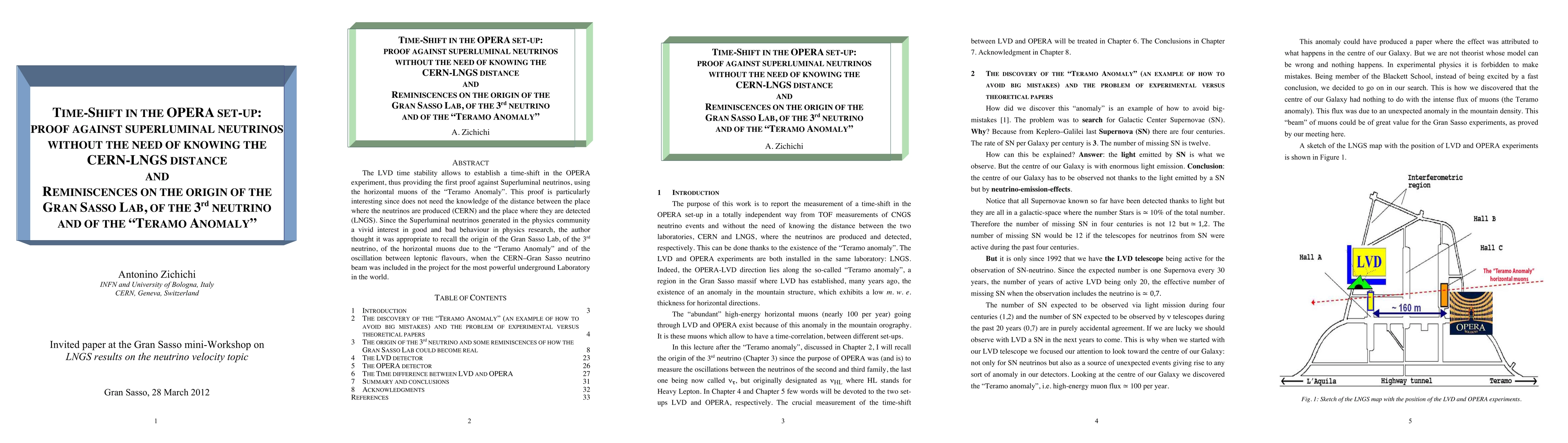 The LVD experiment's time stability demonstrates a time-shift in the OPERA setup, providing evidence against superluminal neutrinos without requiring the CERN-LNGS distance. This proof leverages horizontal muons from the "Teramo Anomaly," highlighting the historical context of the Gran Sasso Lab and the third neutrino.