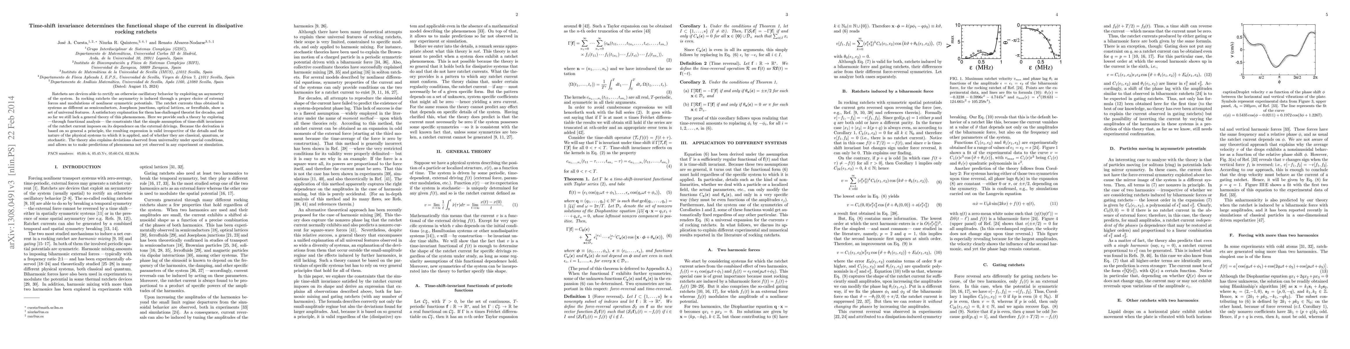 This paper develops a general theory explaining the universal features of currents in dissipative rocking ratchets based on time-shift invariance, applicable across various physical systems, and predicts phenomena not yet observed. It addresses the long-standing challenge of understanding the functional shape of currents in these asymmetric rectifying devices.
