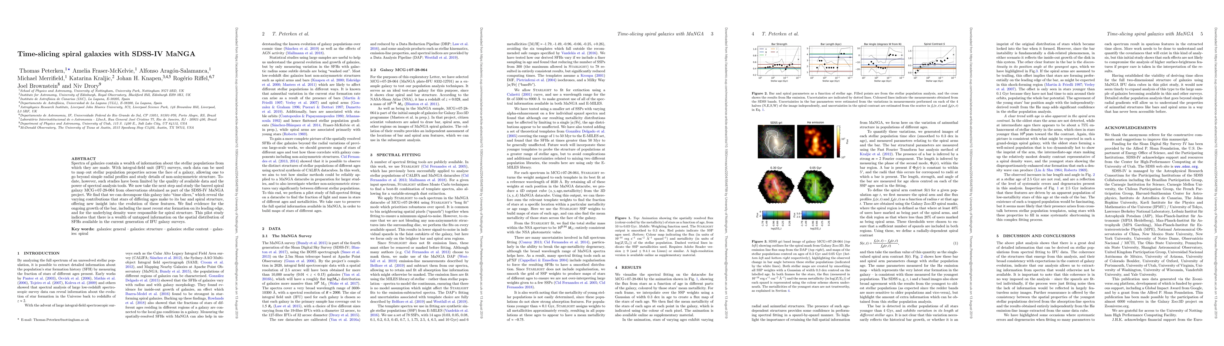 This study uses SDSS-IV MaNGA data to analyze the barred spiral galaxy MCG+07-28-064, revealing how different stellar ages contribute to its bar and spiral structure through time-slicing. The findings suggest ongoing bar growth and the presence of a density wave in the spiral structure, highlighting the potential of current IFU surveys for detailed stellar population studies.