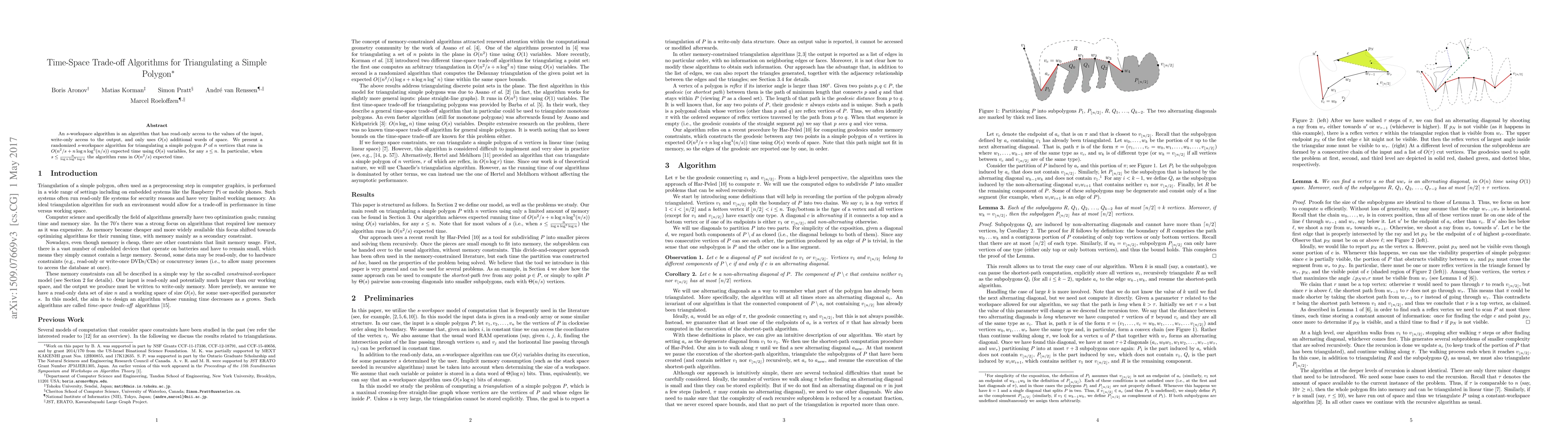 An $s$-workspace algorithm is an algorithm that has read-only access to the values of the input, write-only access to the output, and only uses $O(s)$ additional words of space. We present a randomized $s$-workspace algorithm for triangulating a simple polygon $P$ of $n$ vertices that runs in $O(n^2/s+n \log n \log^{5} (n/s))$ expected time using $O(s)$ variables, for any $s \leq n$. In particular, when $s \leq \frac{n}{\log n\log^{5}\log n}$ the algorithm runs in $O(n^2/s)$ expected time.