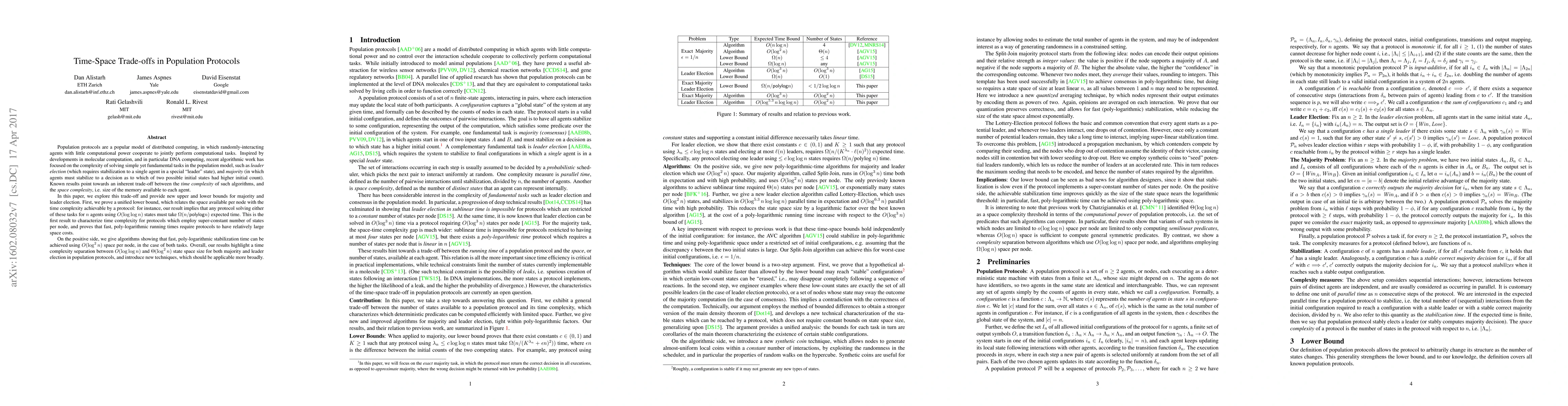 A new study explores the trade-off between time and space complexity in population protocols, showing that fast algorithms for tasks like majority and leader election require large memory usage, while slower algorithms can achieve faster times with less memory.