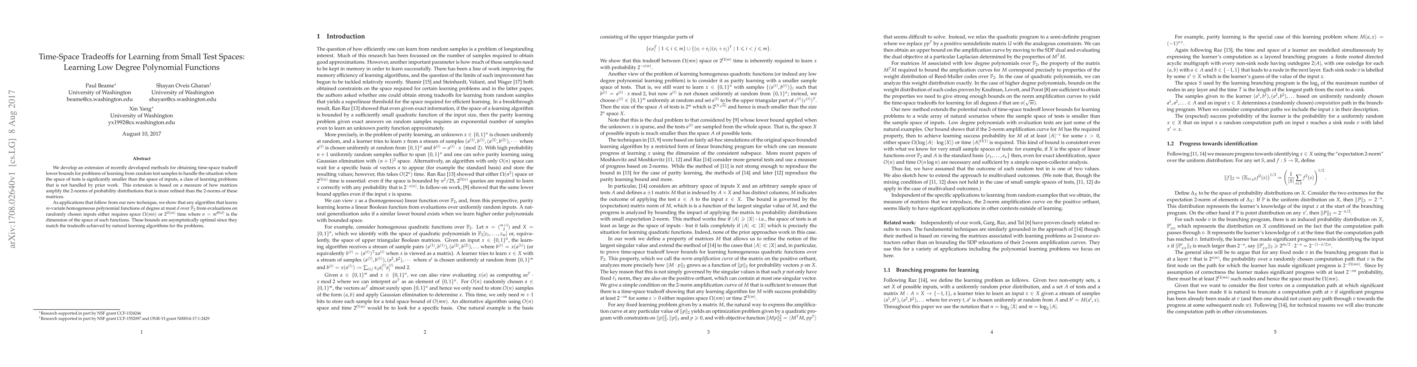We develop an extension of recently developed methods for obtaining time-space tradeoff lower bounds for problems of learning from random test samples to handle the situation where the space of tests is signficantly smaller than the space of inputs, a class of learning problems that is not handled by prior work. This extension is based on a measure of how matrices amplify the 2-norms of probability distributions that is more refined than the 2-norms of these matrices. As applications that follow from our new technique, we show that any algorithm that learns $m$-variate homogeneous polynomial functions of degree at most $d$ over $\mathbb{F}_2$ from evaluations on randomly chosen inputs either requires space $\Omega(mn)$ or $2^{\Omega(m)}$ time where $n=m^{\Theta(d)}$ is the dimension of the space of such functions. These bounds are asymptotically optimal since they match the tradeoffs achieved by natural learning algorithms for the problems.