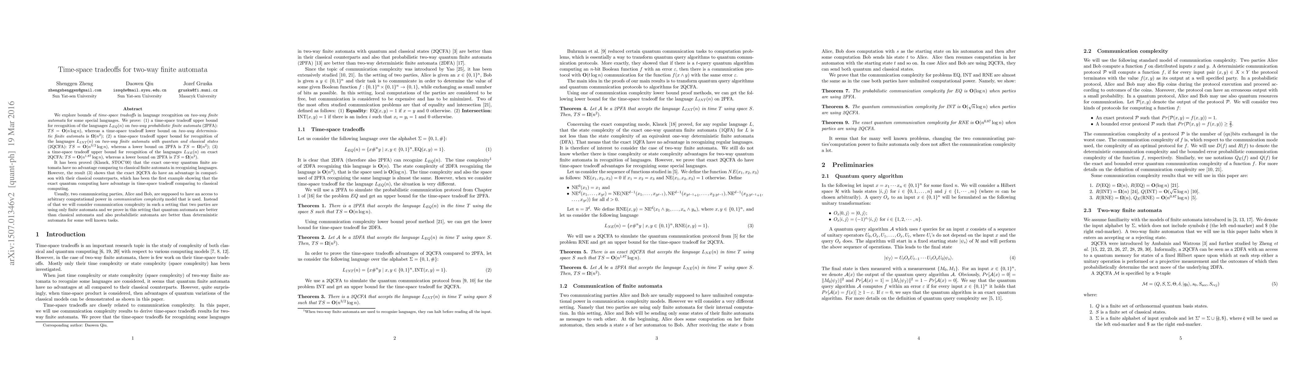 This paper investigates time-space tradeoffs for recognizing specific languages using two-way finite automata, demonstrating that quantum automata outperform classical ones in certain scenarios. It establishes upper and lower bounds for probabilistic, deterministic, and quantum two-way finite automata, showing advantages for quantum and probabilistic models over classical ones.