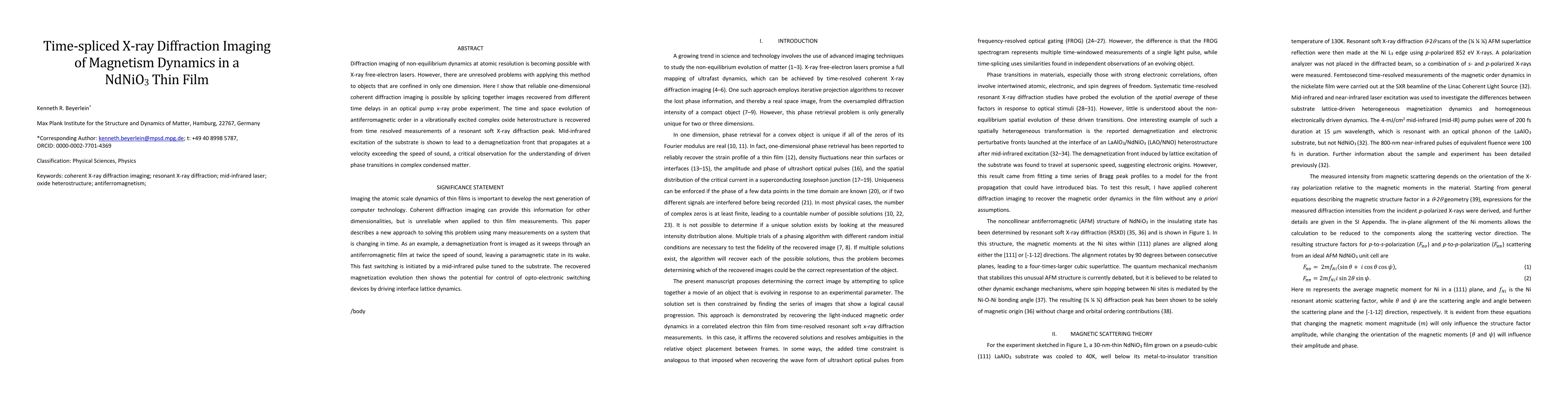 This paper demonstrates a technique for one-dimensional coherent diffraction imaging using time-spliced X-ray diffraction imaging from different delays, enabling the study of non-equilibrium dynamics in atomic resolution. It applies this method to observe the rapid propagation of a magnetic front in a complex oxide heterostructure, providing insights into driven phase transitions.