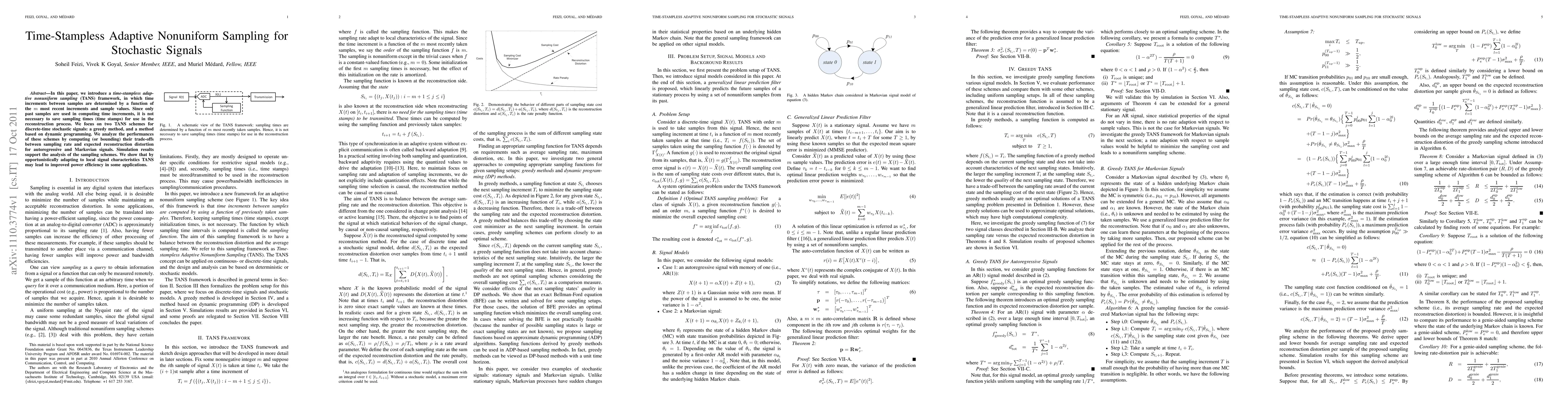 This paper introduces a time-stampless adaptive nonuniform sampling (TANS) framework for stochastic signals, employing a function of recent sample values to determine time increments without needing saved time stamps. It evaluates two TANS schemes—greedy and dynamic programming—and demonstrates improved power efficiency through adaptive sampling.