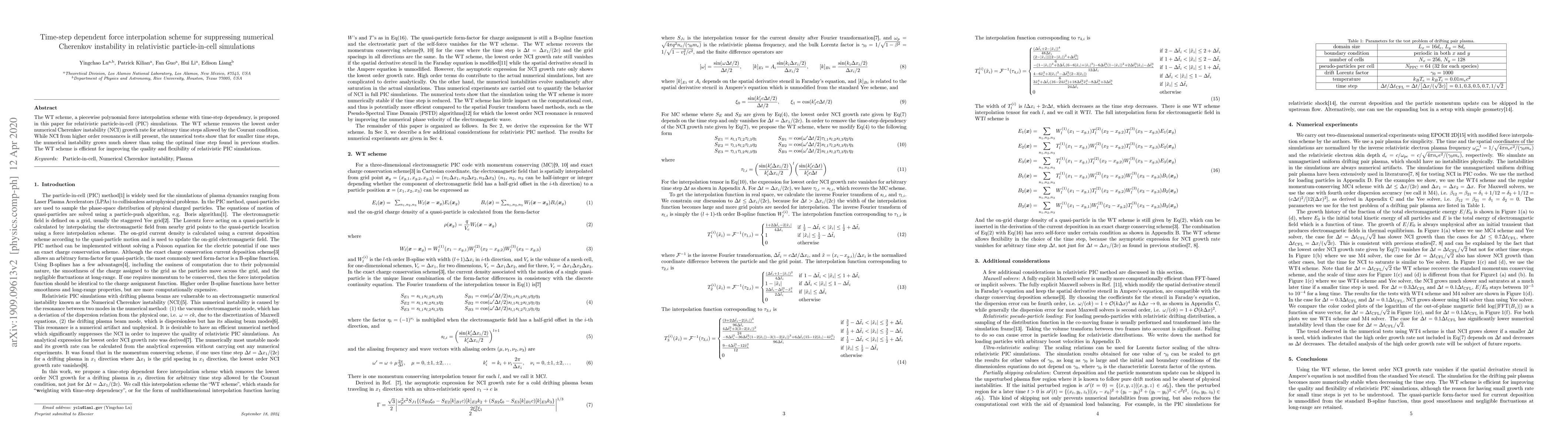 The WT scheme, a piecewise polynomial force interpolation scheme with time-step dependency, is proposed in this paper for relativistic particle-in-cell (PIC) simulations. The WT scheme removes the lowest order numerical Cherenkov instability (NCI) growth rate for arbitrary time steps allowed by the Courant condition. While NCI from higher order resonances is still present, the numerical tests show that for smaller time steps, the numerical instability grows much slower than using the optimal time step found in previous studies. The WT scheme is efficient for improving the quality and flexibility of relativistic PIC simulations.