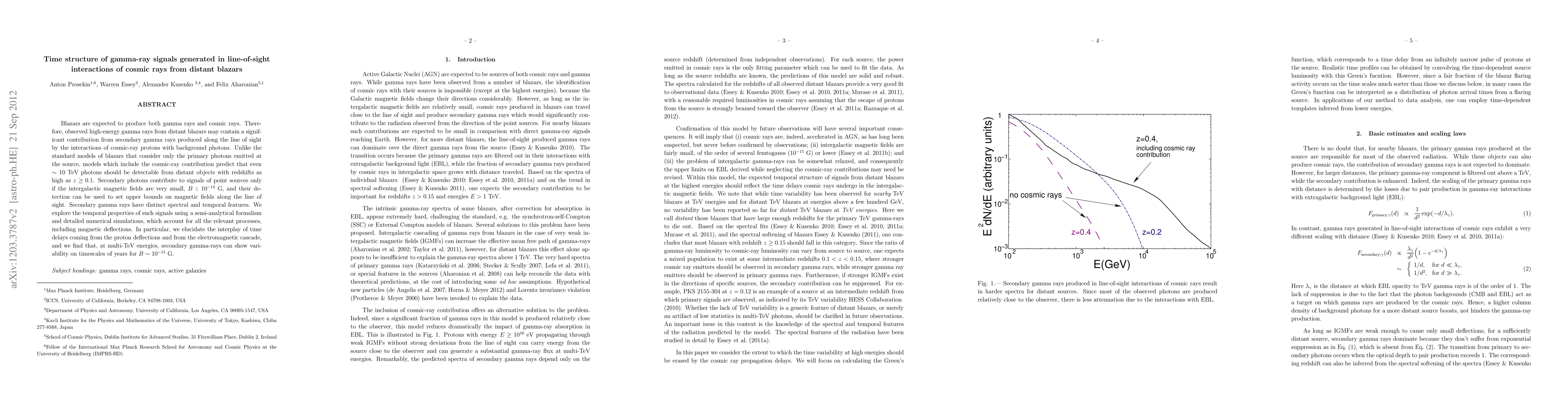 Blazars are expected to produce both gamma rays and cosmic rays. Therefore, observed high-energy gamma rays from distant blazars may contain a significant contribution from secondary gamma rays produced along the line of sight by the interactions of cosmic-ray protons with background photons. Unlike the standard models of blazars that consider only the primary photons emitted at the source, models which include the cosmic-ray contribution predict that even ~10 TeV photons should be detectable from distant objects with redshifts as high as z> 0.1. Secondary photons contribute to signals of point sources only if the intergalactic magnetic fields are very small, below ~10 femtogauss, and their detection can be used to set upper bounds on magnetic fields along the line of sight. Secondary gamma rays have distinct spectral and temporal features. We explore the temporal properties of such signals using a semi-analytical formalism and detailed numerical simulations, which account for all the relevant processes, including magnetic deflections. In particular, we elucidate the interplay of time delays coming from the proton deflections and from the electromagnetic cascade, and we find that, at multi-TeV energies, secondary gamma-rays can show variability on timescales of years for femtogauss magnetic fields.