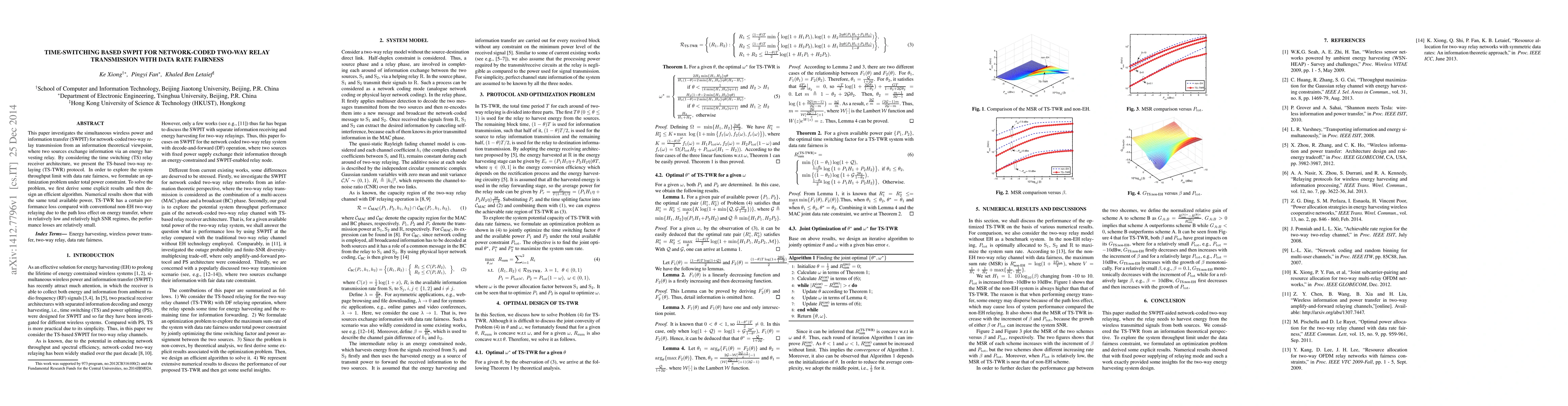This paper proposes a time-switching based protocol for simultaneous wireless power and information transfer (SWPIT) in network-coded two-way relaying, aiming for data rate fairness. The study formulates an optimization problem and designs an efficient algorithm to maximize throughput under power constraints, showing minimal performance loss in low and high SNR regimes.