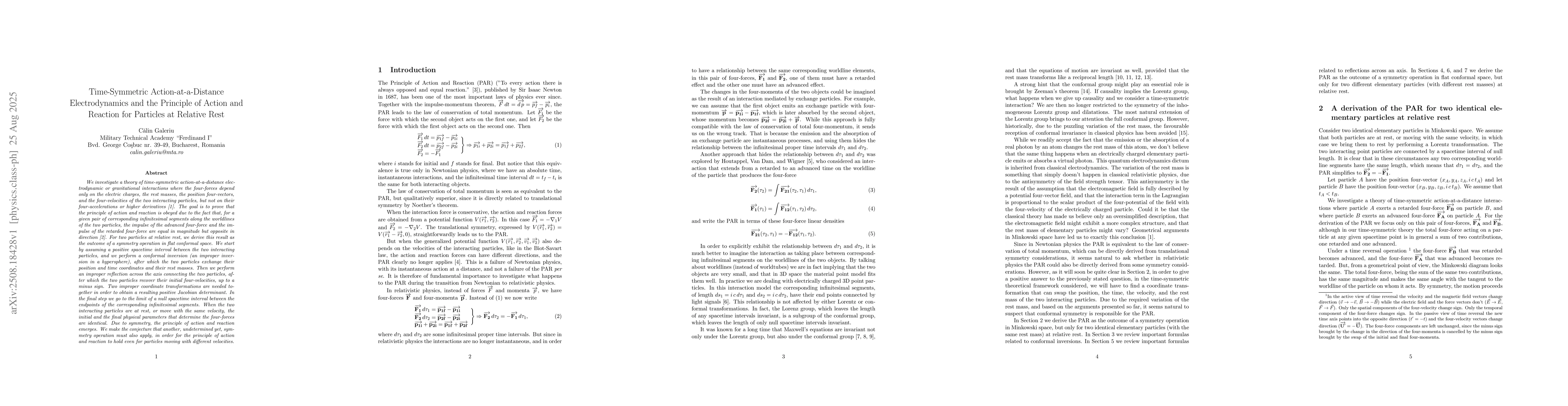 We investigate a theory of time-symmetric action-at-a-distance electrodynamic or gravitational interactions where the four-forces depend only on the electric charges, the rest masses, the position four-vectors, and the four-velocities of the two interacting particles, but not on their four-accelerations or higher derivatives. The goal is to prove that the principle of action and reaction is obeyed due to the fact that, for a given pair of corresponding infinitesimal segments along the worldlines of the two particles, the impulse of the advanced four-force and the impulse of the retarded four-force are equal in magnitude but opposite in direction. For two particles at relative rest, we derive this result as the outcome of a symmetry operation in flat conformal space. We start by assuming a positive spacetime interval between the two interacting particles, and we perform a conformal inversion (an improper inversion in a hypersphere), after which the two particles exchange their position and time coordinates and their rest masses. Then we perform an improper reflection across the axis connecting the two particles, after which the two particles recover their initial four-velocities, up to a minus sign. Two improper coordinate transformations are needed together in order to obtain a resulting positive Jacobian determinant. In the final step we go to the limit of a null spacetime interval between the endpoints of the corresponding infinitesimal segments. When the two interacting particles are at rest, or move with the same velocity, the initial and the final physical parameters that determine the four-forces are identical. Due to symmetry, the principle of action and reaction emerges. We make the conjecture that another, undetermined yet, symmetry operation must also apply, in order for the principle of action and reaction to hold even for particles moving with different velocities.
