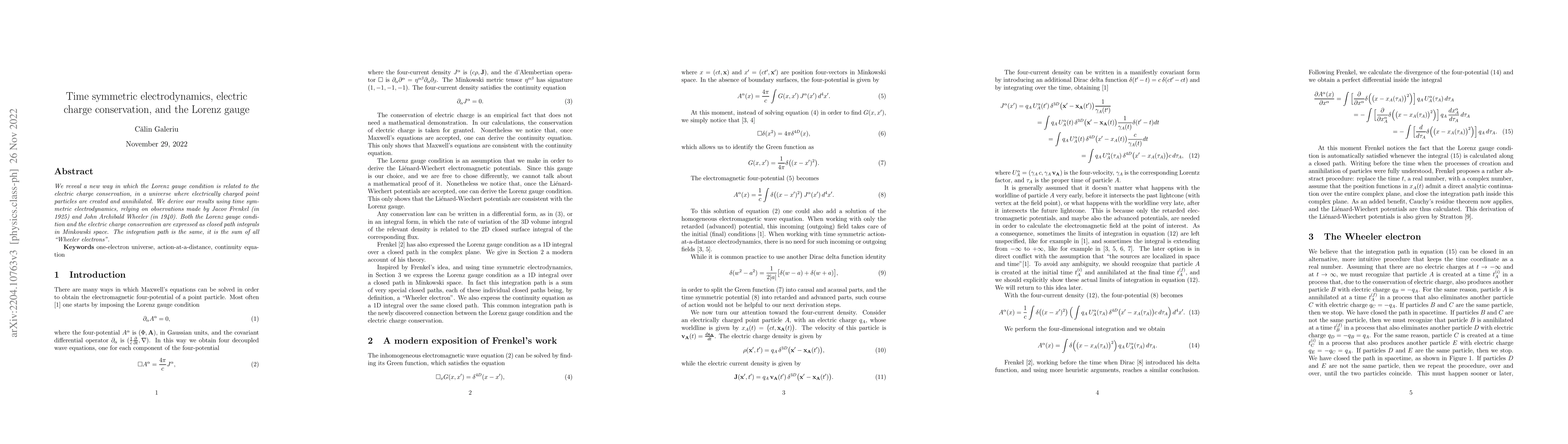 We reveal a new way in which the Lorenz gauge condition is related to the electric charge conservation, in a universe where electrically charged point particles are created and annihilated. We derive our results using time symmetric electrodynamics, relying on observations made by Jacov Frenkel (in 1925) and John Archibald Wheeler (in 1940). Both the Lorenz gauge condition and the electric charge conservation are expressed as closed path integrals in Minkowski space. The integration path is the same, it is the sum of all "Wheeler electrons".