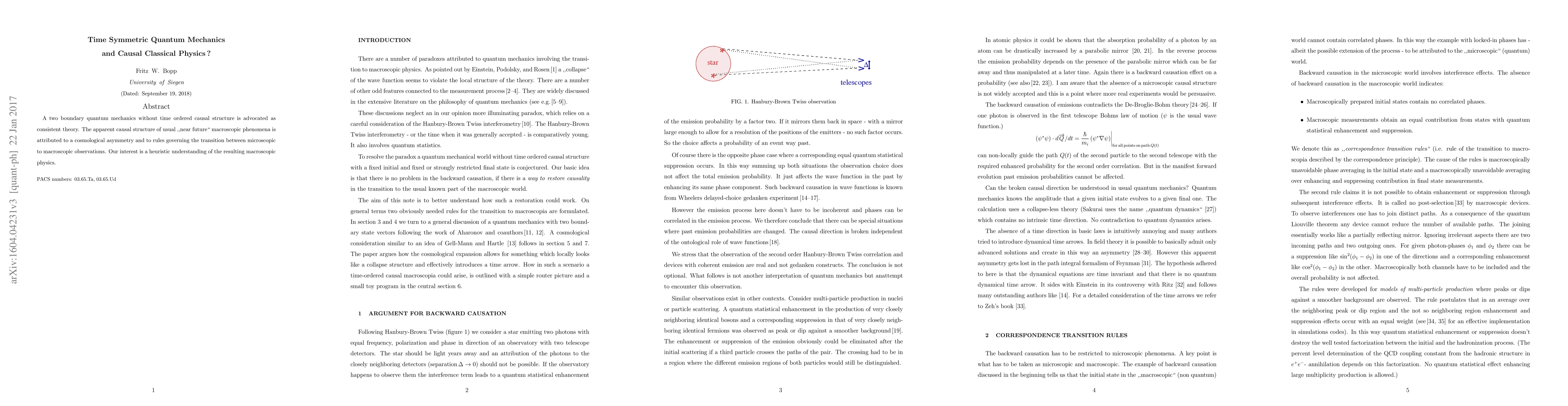 This paper proposes a time symmetric quantum mechanics framework that lacks a time-ordered causal structure, attributing the observed causal order in classical physics to cosmological asymmetry and transition rules between microscopic and macroscopic observations. The aim is to provide a heuristic understanding of the emergent macroscopic physics.