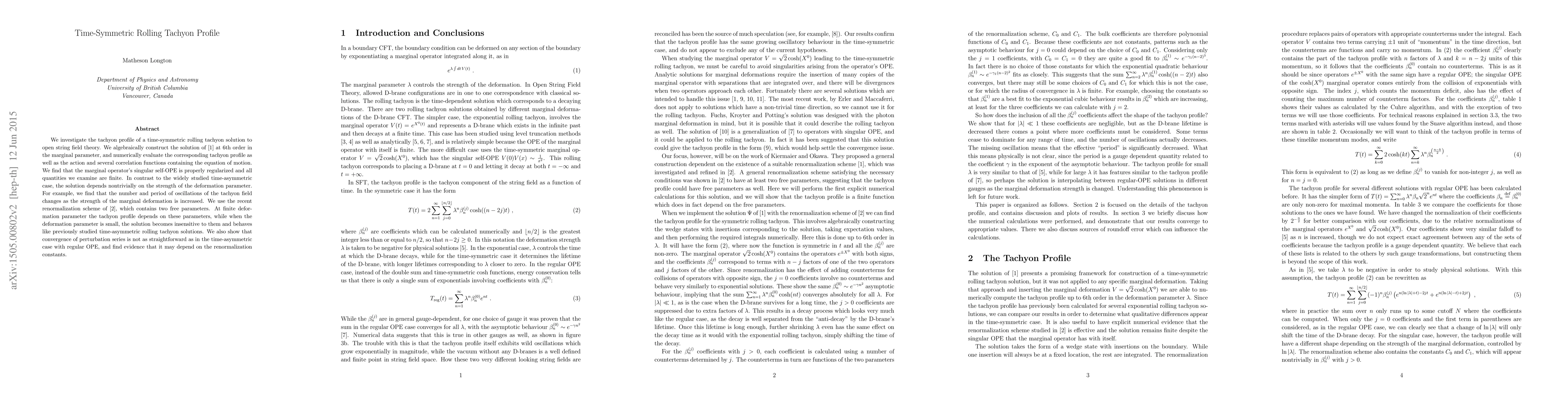 The paper presents an algebraic construction of the tachyon profile solution at 6th order and a numerical evaluation, incorporating a recent renormalization scheme with two free parameters.