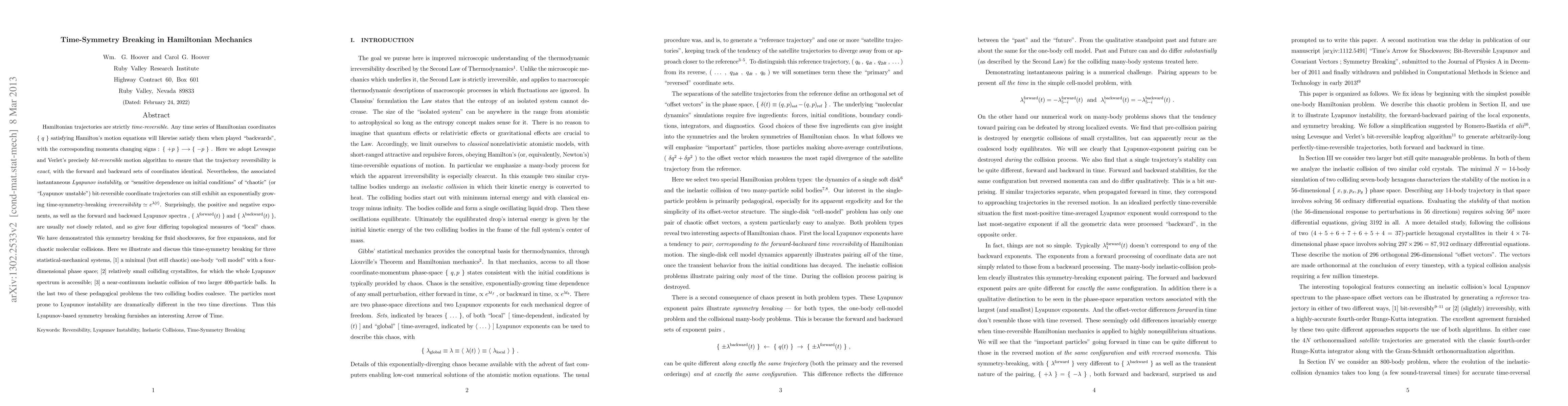 Hamiltonian trajectories are strictly time-reversible. Any time series of Hamiltonian coordinates {q} satisfying Hamilton's motion equations will likewise satisfy them when played "backwards", with the corresponding momenta changing signs : {+p} --> {-p}. Here we adopt Levesque and Verlet's precisely bit-reversible motion algorithm to ensure that the trajectory reversibility is exact, with the forward and backward sets of coordinates identical. Nevertheless, the associated instantaneous Lyapunov instability, or "sensitive dependence on initial conditions" of "chaotic" (or "Lyapunov unstable") bit-reversible coordinate trajectories can still exhibit an exponentially growing time-symmetry-breaking irreversibility. Surprisingly, the positive and negative exponents, as well as the forward and backward Lyapunov spectra, are usually not closely related, and so give four differing topological measures of "local" chaos. We have demonstrated this symmetry breaking for fluid shockwaves, for free expansions, and for chaotic molecular collisions. Here we illustrate and discuss this time-symmetry breaking for three statistical-mechanical systems, [1] a minimal (but still chaotic) one-body "cell model" with a four-dimensional phase space; [2] relatively small colliding crystallites, for which the whole Lyapunov spectrum is accessible; [3] a near-continuum inelastic collision of two larger 400-particle balls. In the last two of these pedagogical problems the two colliding bodies coalesce. The particles most prone to Lyapunov instability are dramatically different in the two time directions. Thus this Lyapunov-based symmetry breaking furnishes an interesting Arrow of Time.