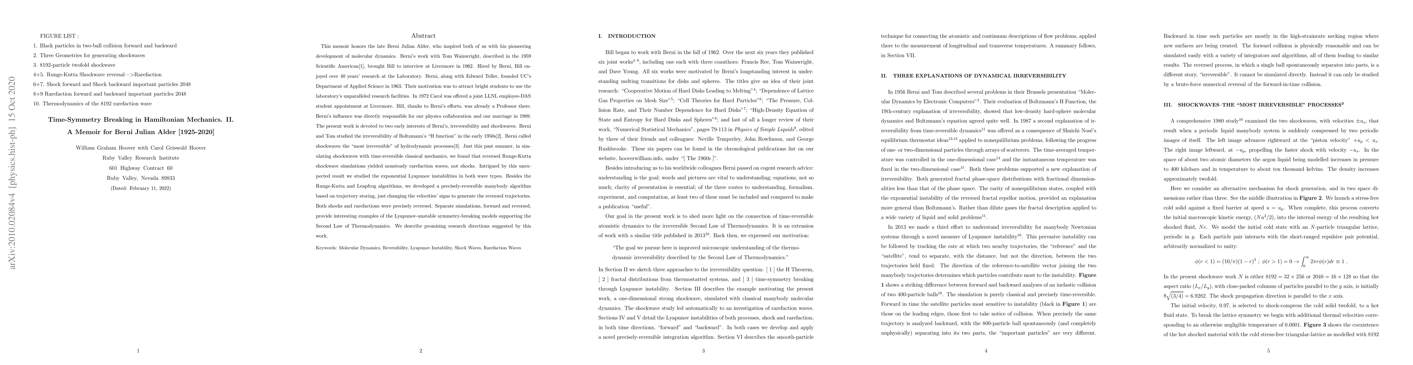 This memoir honors the late Berni Julian Alder, who inspired both of us with his pioneering development of molecular dynamics. Berni's work with Tom Wainwright, described in the 1959 Scientific American[1], brought Bill to interview at Livermore in 1962. Hired by Berni, Bill enjoyed over 40 years' research at the Laboratory. Berni, along with Edward Teller, founded UC's Department of Applied Science in 1963. Their motivation was to attract bright students to use the laboratory's unparalleled research facilities. In 1972 Carol was offered a joint LLNL employee-DAS student appointment at Livermore. Bill, thanks to Berni's efforts, was already a Professor at DAS. Carol became one of Bill's best students. Berni's influence was directly responsible for our physics collaboration and our marriage in 1989. The present work is devoted to two early interests of Berni's, irreversibility and shockwaves. Berni and Tom studied the irreversibility of Boltzmann's "H function" in the early 1950s[2]. Berni called shockwaves the "most irreversible" of hydrodynamic processes[3]. Just this past summer, in simulating shockwaves with time-reversible classical mechanics, we found that reversed Runge-Kutta shockwave simulations yielded nonsteady rarefaction waves, not shocks. Intrigued by this unexpected result we studied the exponential Lyapunov instabilities in both wave types. Besides the Runge-Kutta and Leapfrog algorithms, we developed a precisely-reversible manybody algorithm based on trajectory storing, just changing the velocities' signs to generate the reversed trajectories. Both shocks and rarefactions were precisely reversed. Separate simulations, forward and reversed, provide interesting examples of the Lyapunov-unstable symmetry-breaking models supporting the Second Law of Thermodynamics. We describe promising research directions suggested by this work.