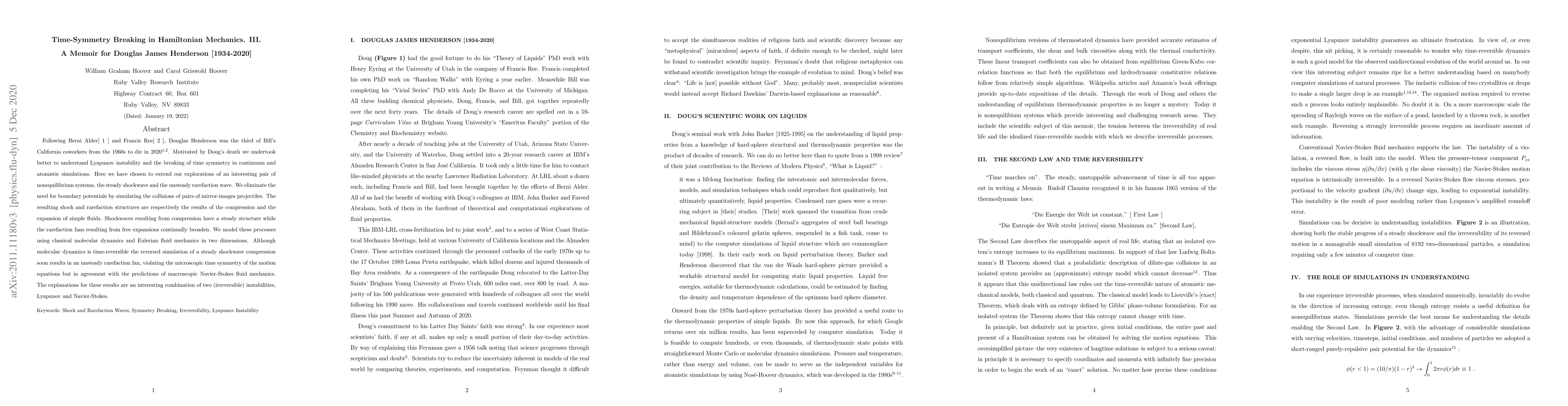 Following Berni Alder [1] and Francis Ree [2], Douglas Henderson was the third of Bill's California coworkers from the 1960s to die in 2020. Motivated by Doug's death we undertook better to understand Lyapunov instability and the breaking of time symmetry in continuum and atomistic simulations. Here we have chosen to extend our explorations of an interesting pair of nonequilibrium systems, the steady shockwave and the unsteady rarefaction wave. We eliminate the need for boundary potentials by simulating the collisions of pairs of mirror-images projectiles. The resulting shock and rarefaction structures are respectively the results of the compression and the expansion of simple fluids. Shockwaves resulting from compression have a steady structure while the rarefaction fans resulting from free expansions continually broaden. We model these processes using classical molecular dynamics and Eulerian fluid mechanics in two dimensions. Although molecular dynamics is time-reversible the reversed simulation of a steady shockwave compression soon results in an unsteady rarefaction fan, violating the microscopic time symmetry of the motion equations but in agreement with the predictions of macroscopic Navier-Stokes fluid mechanics. The explanations for these results are an interesting combination of two (irreversible) instabilities, Lyapunov and Navier-Stokes.
