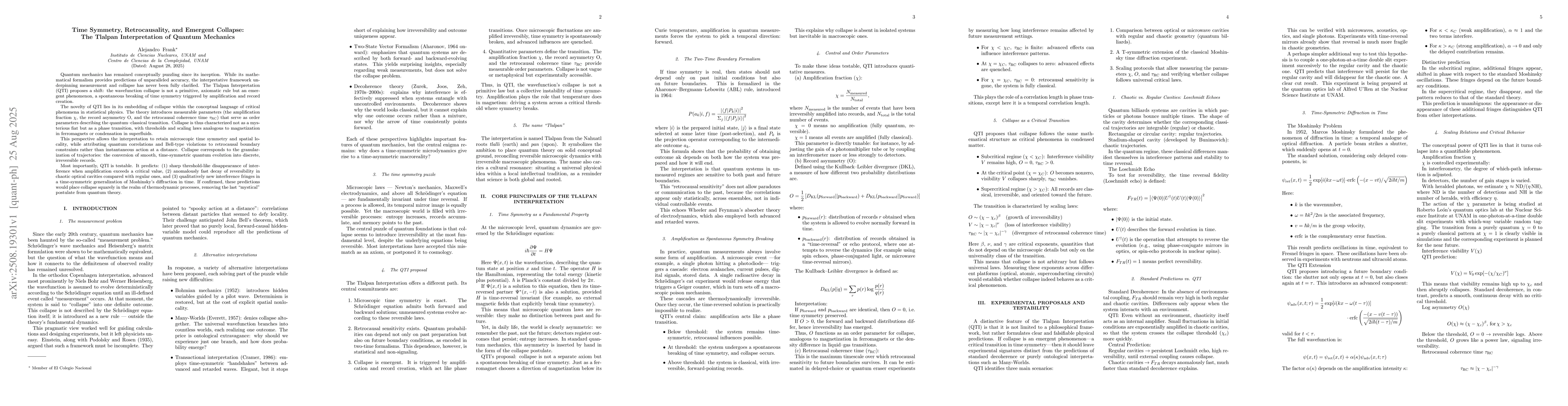 Quantum mechanics has remained conceptually puzzling since its inception. While its mathematical formalism provides predictions of unparalleled accuracy, the interpretative framework underpinning measurement and collapse has never been fully clarified. The Tlalpan Interpretation (QTI) proposes that the wavefunction collapse is not a primitive, axiomatic rule but an emergent phenomenon, a spontaneous breaking of time symmetry triggered by amplification and record creation. The novelty of QTI lies in its embedding of collapse within the conceptual language of critical phenomena in statistical physics. The theory introduces measurable parameters (the amplification fraction, the record asymmetry, and the retrocausal coherence time) that serve as order parameters describing the quantum-classical transition. Collapse is thus characterized not as a mysterious fiat but as a phase transition, with thresholds and scaling laws analogous to magnetization in ferromagnets. This perspective allows the interpretation to retain microscopic time symmetry and spatial locality, while attributing quantum correlations and Bell-type violations to retrocausal boundary constraints rather than instantaneous action at a distance. Collapse corresponds to the granularization of trajectories: the conversion of smooth, time-symmetric quantum evolution into discrete, irreversible records. Most importantly, QTI is testable. It predicts: (1) sharp threshold-like disappearance of interference when amplification exceeds a critical value, (2) anomalously fast decay of reversibility in chaotic optical cavities compared with regular ones, and (3) qualitatively new interference fringes in a time-symmetric generalization of Moshinsky's diffraction in time. If confirmed, these predictions would place collapse squarely in the realm of thermodynamic processes, removing the last "mystical" postulate from quantum theory.
