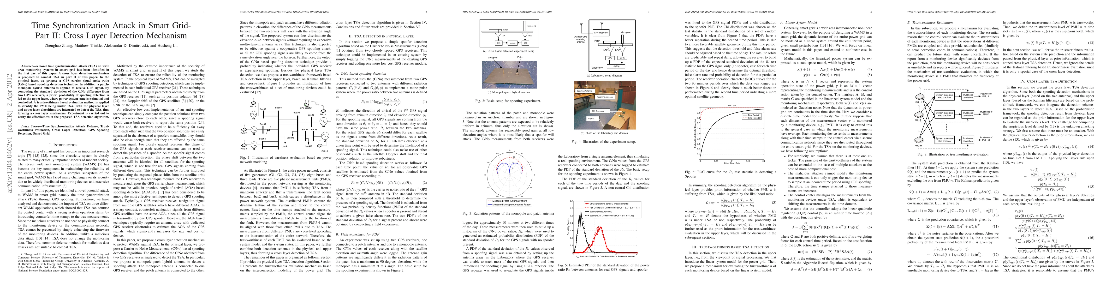 A novel time synchronization attack (TSA) on wide area monitoring systems in smart grid has been identified in the first part of this paper. A cross layer detection mechanism is proposed to combat TSA in part II of this paper. In the physical layer, we propose a GPS carrier signal noise ratio (C/No) based spoofing detection technique. In addition, a patch-monopole hybrid antenna is applied to receive GPS signal. By computing the standard deviation of the C/No difference from two GPS receivers, a priori probability of spoofing detection is fed to the upper layer, where power system state is estimated and controlled. A trustworthiness based evaluation method is applied to identify the PMU being under TSA. Both the physical layer and upper layer algorithms are integrated to detect the TSA, thus forming a cross layer mechanism. Experiment is carried out to verify the effectiveness of the proposed TSA detection algorithm.