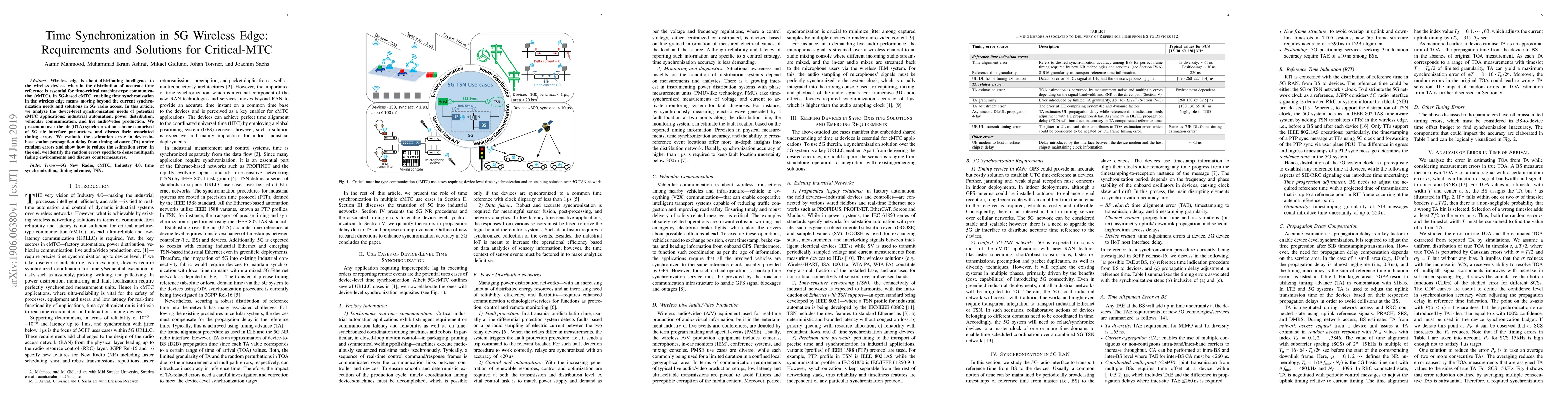 This paper explores the requirements for time synchronization in 5G wireless edge networks for critical machine-type communication (cMTC) applications. It proposes an over-the-air synchronization scheme to address device-level synchronization needs and discusses methods to reduce timing errors, particularly in dense multipath fading environments.