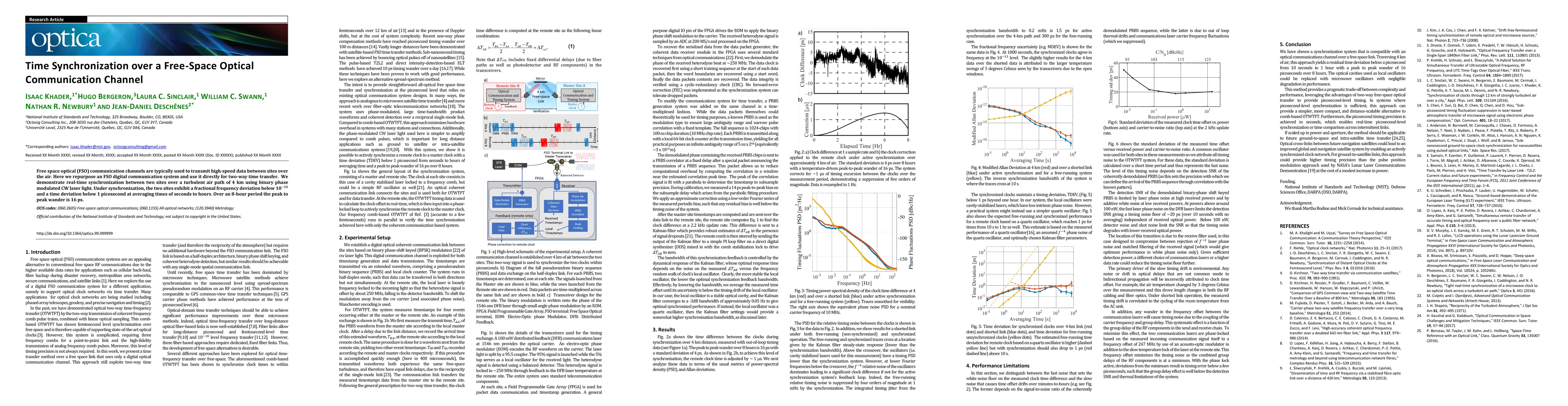 Free space optical (FSO) communication channels are typically used to transmit high-speed data between sites over the air. Here we repurpose an FSO digital communication system and use it directly for two-way time transfer. We demonstrate real-time synchronization between two sites over a turbulent air path of 4 km using binary phase modulated CW laser light. Under synchronization, the two sites exhibit a fractional frequency deviation below $10^{-15}$ and a time deviation below 1 picosecond at averaging times of seconds to hours. Over an 8-hour period the peak to peak wander is 16 ps.